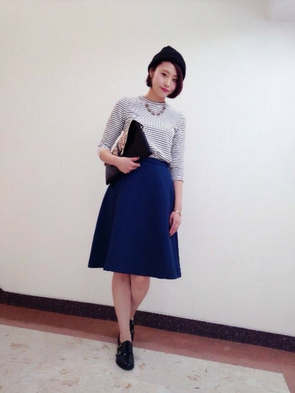 ボーダーにカラースカートにニット帽。休日カジュアルです♪