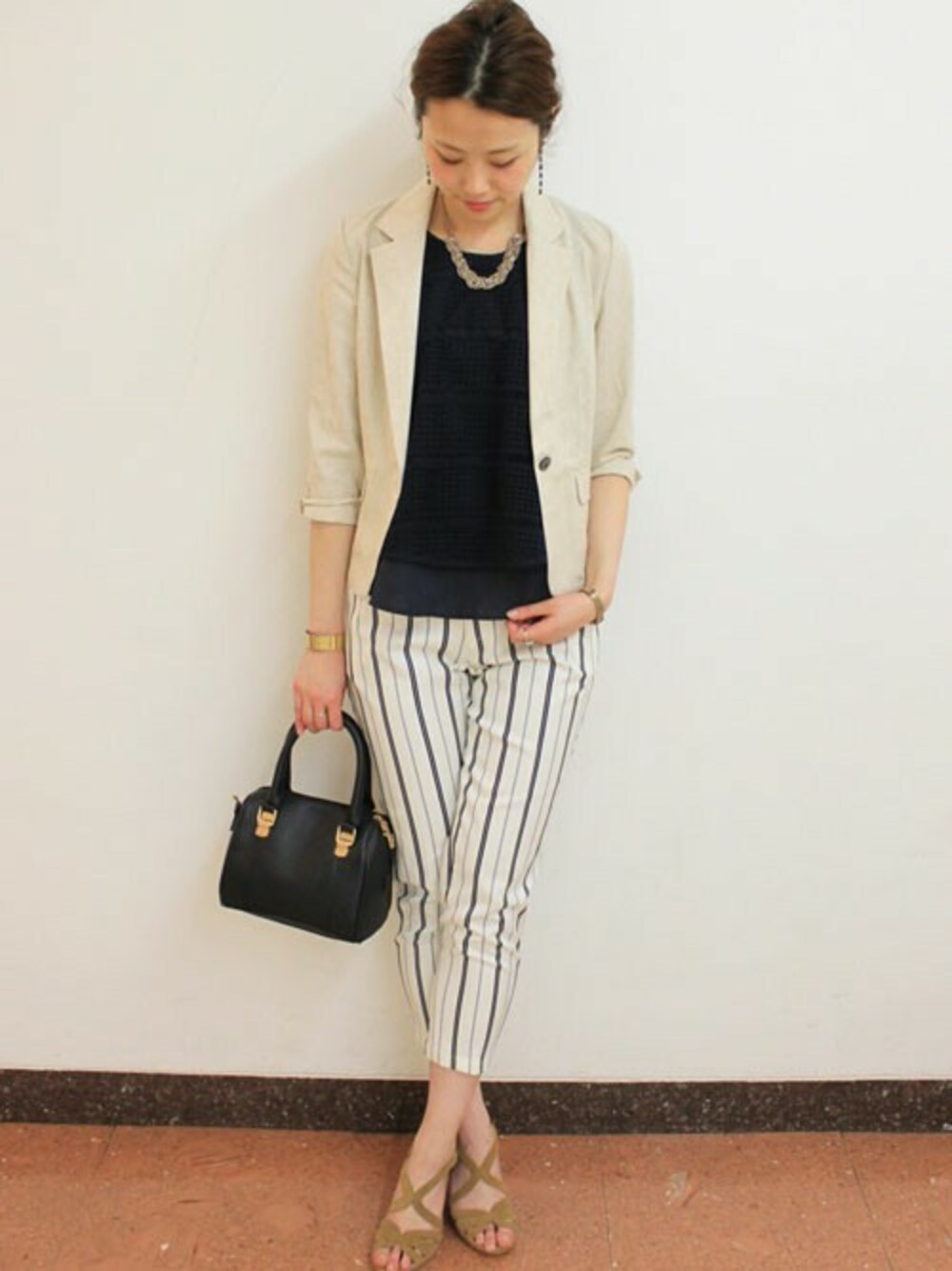 ノースリブラウスをテーラードできれいめ合わせ。