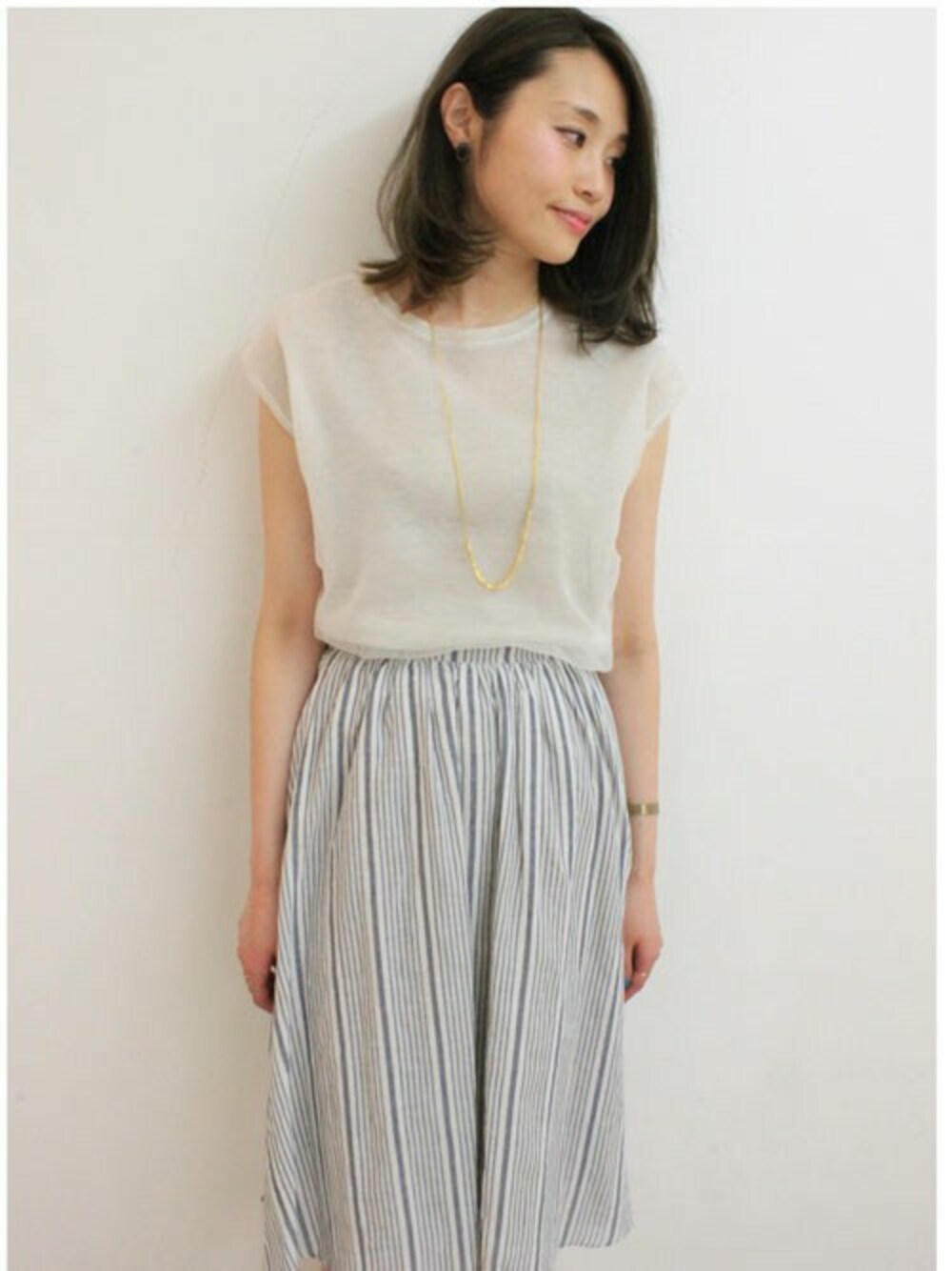 オーガンジーの異素材トップスにブルーのストライプで爽やかコーデ。