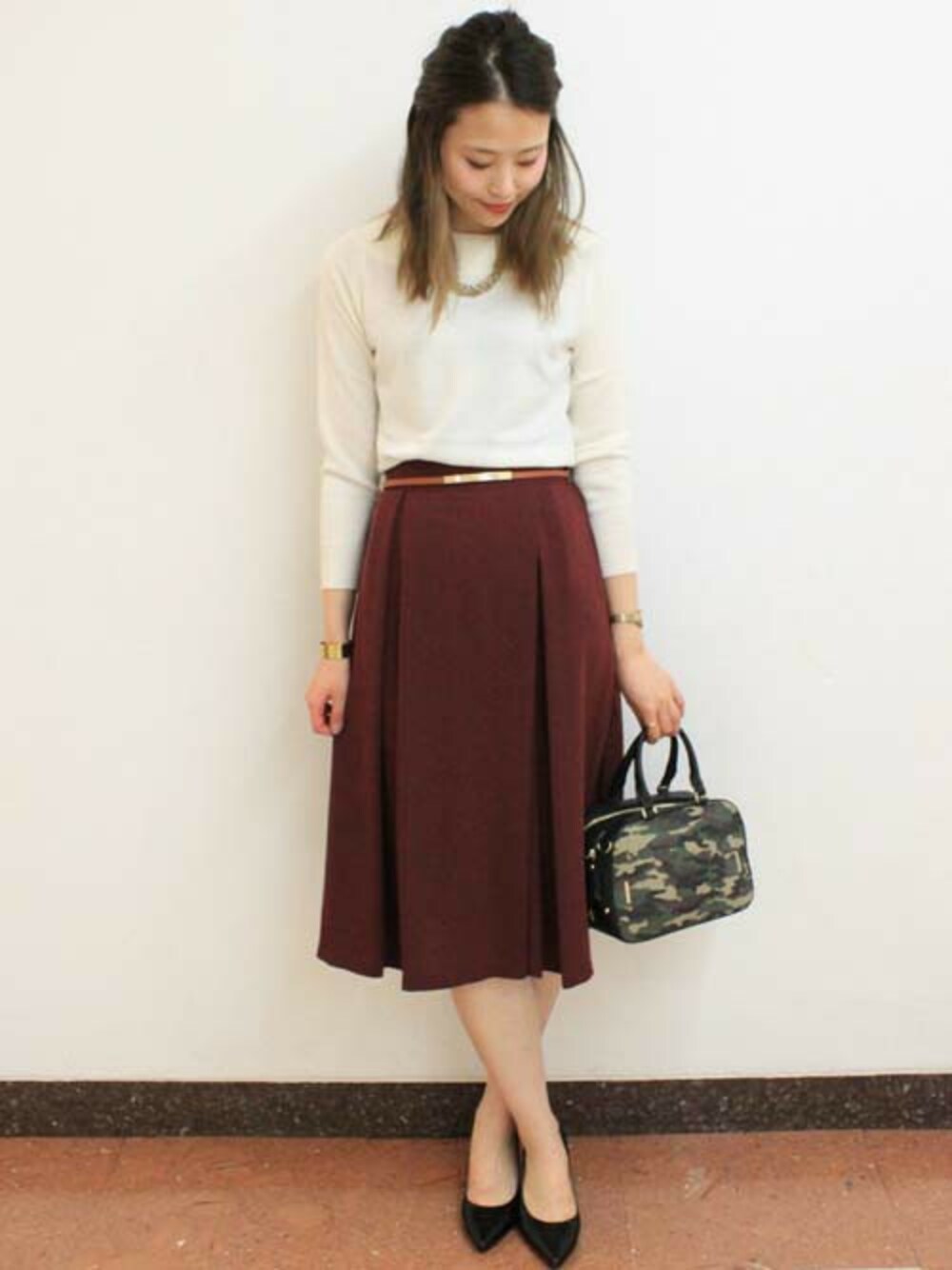 コンパクトなオフショルニットを秋カラーのボルドーを主役にしたコーデ。カモフラ小物で抜け感を。