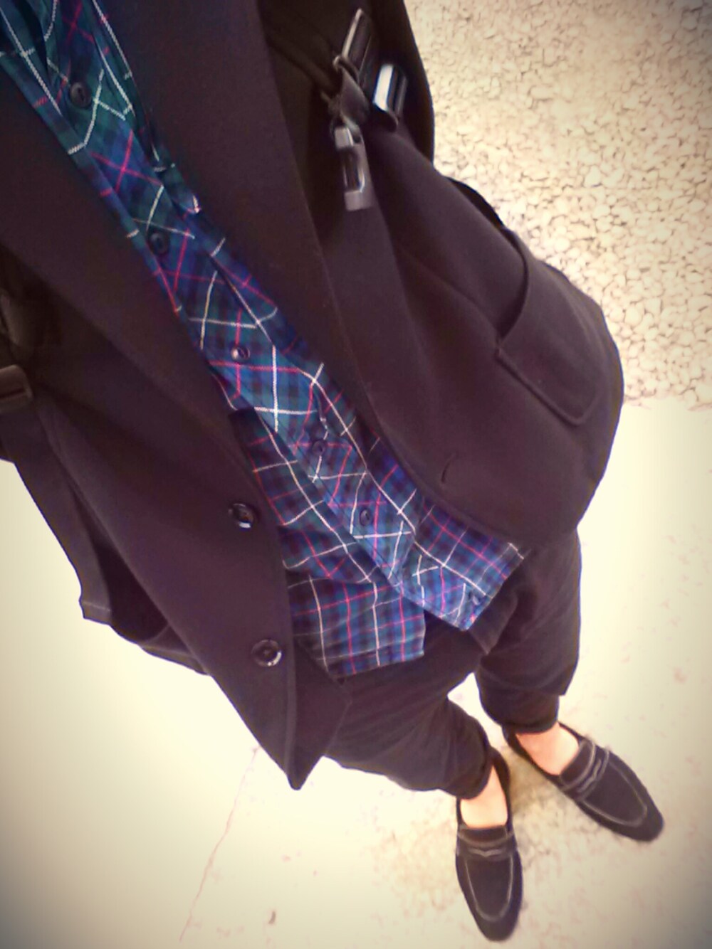 初投稿!♪ ジャケットとパンツは黒で揃えて セットアップ風にしました! 秋らしくインナーはチェックシャツで(^-^) まだまだ初心者なので皆さんの投稿を参考にしていこうと思います(^-^) 勉強ガンバロー!!