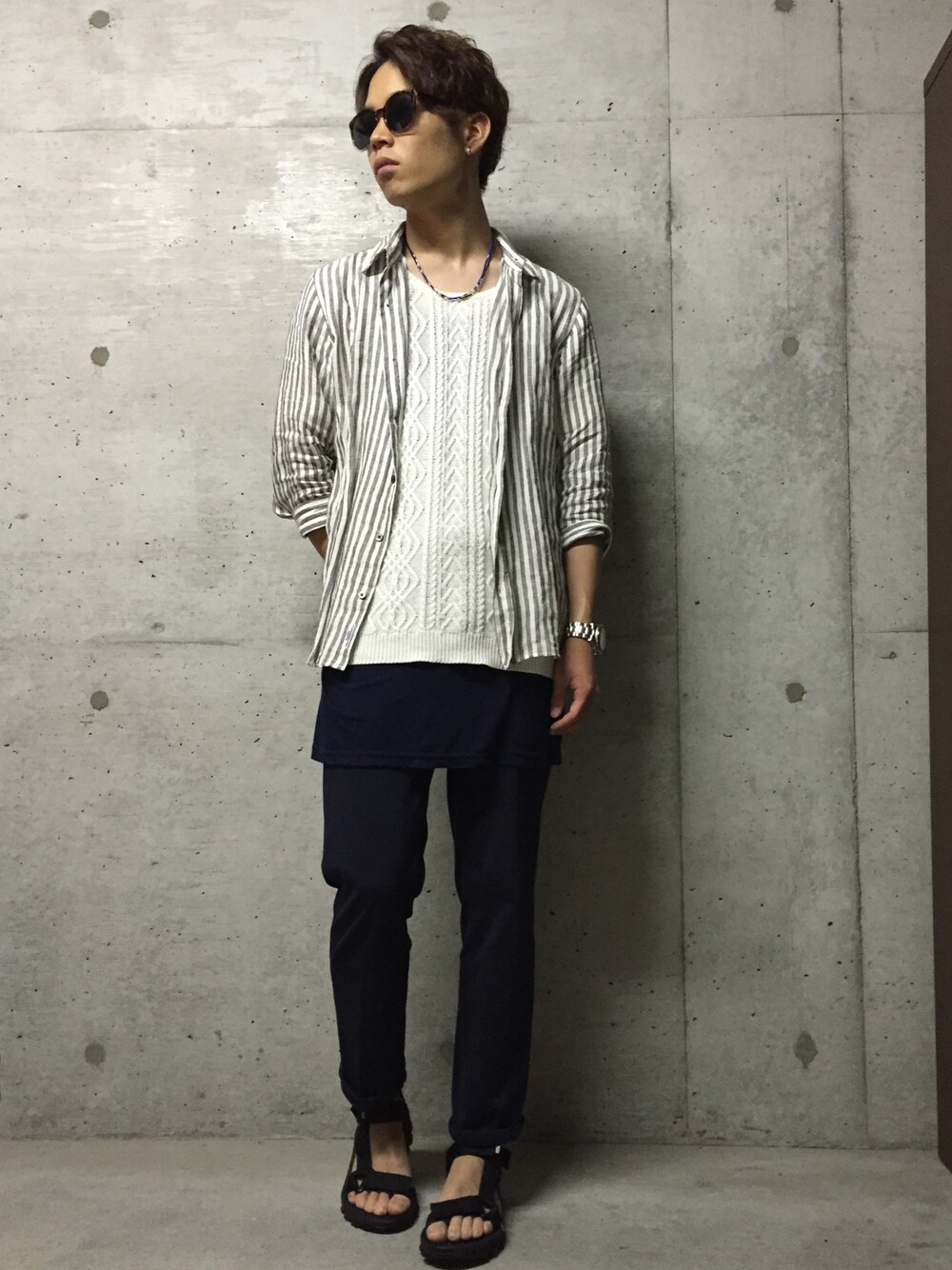 ストライプシャツの初夏Style。 サマーニットをインナーにタンクトップで着丈のバランスを整えました! サンダルとスラックスの組み合わせでモード感を。