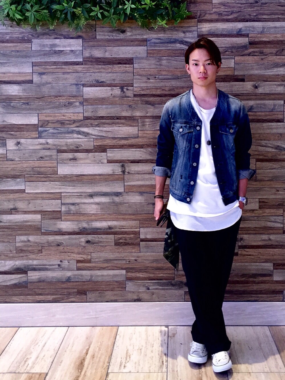 Kyosukeのデニムジャケット「◆CONEデニム ノーカラージャケット(ブラックペイント)」を使ったコーディネート
