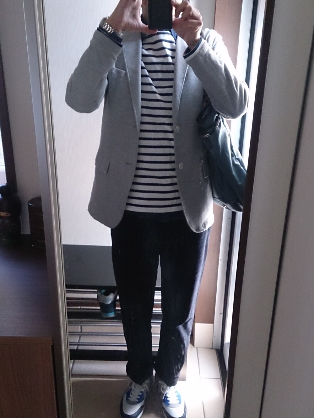 デニムシャツ、ジャケット、チノパン(UNIQLO) バッグ(オロビアンコ)