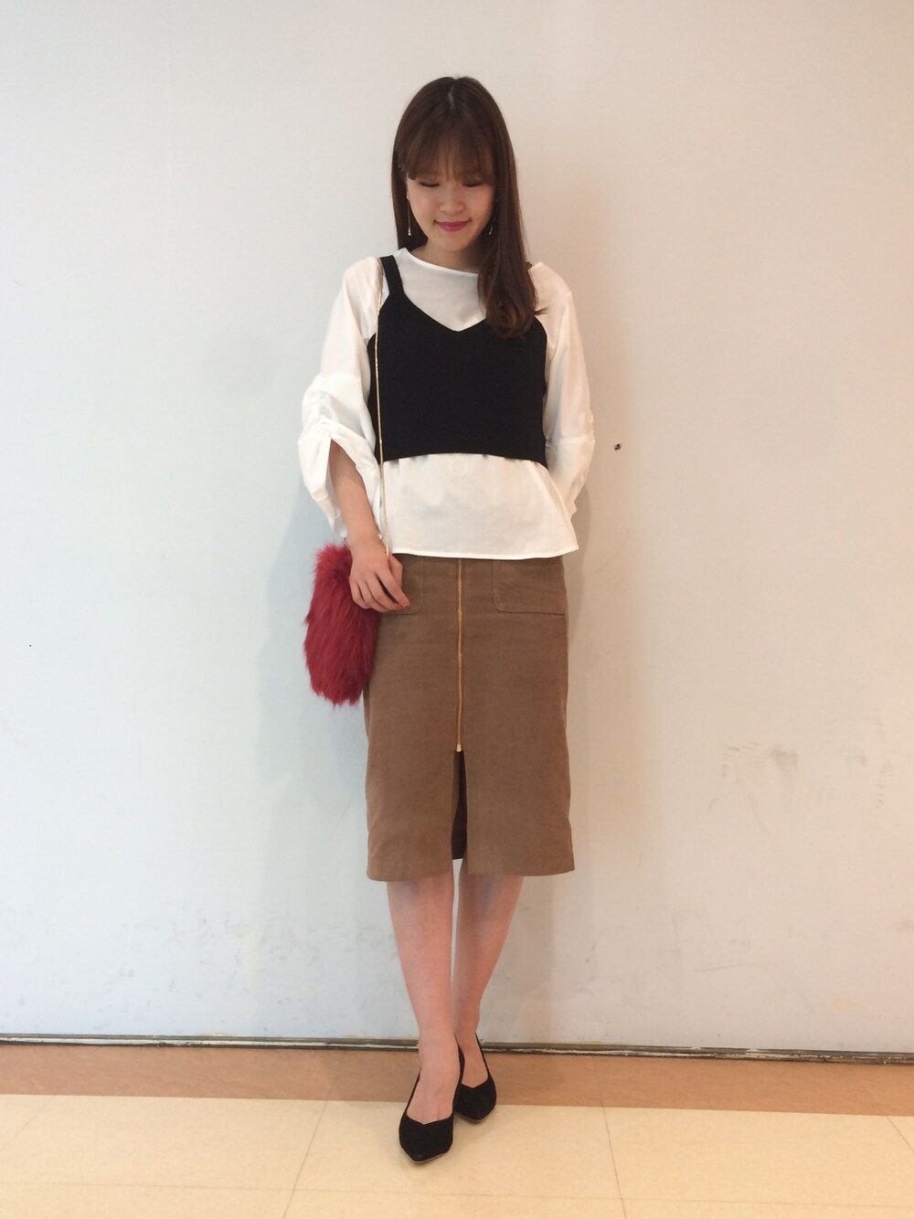 スリットが深めに入ったコーデュロイスカート♪ 今欲しいビスチェアイテムとで 休日の大人カジュアルスタイルに✴︎