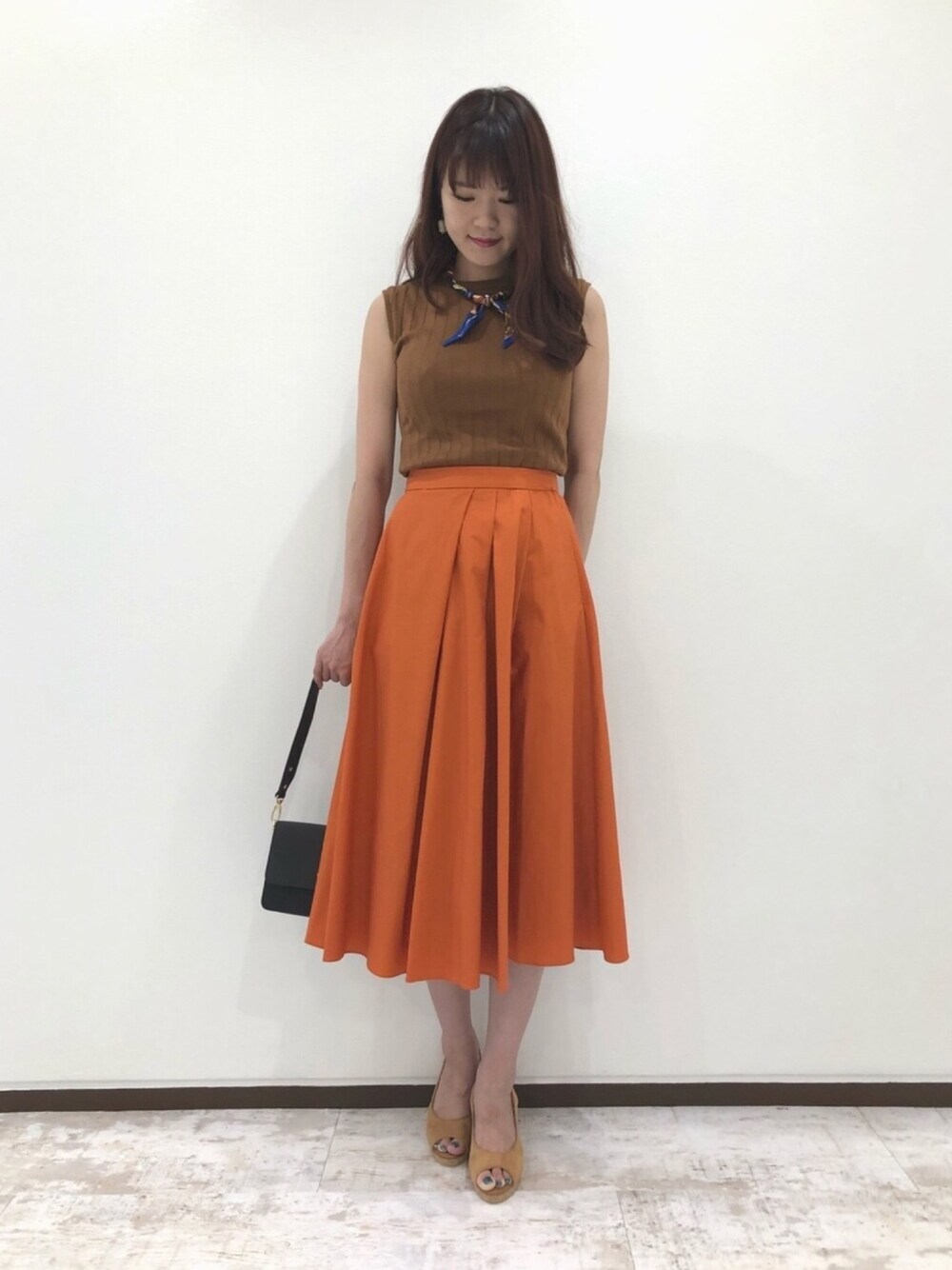 夏から秋に向けての新作が入荷致しました! 腰回りスッキリ見えのタックスカートに 汗の目立ちなく涼しく着て頂ける サマーノースリブ♪ ブラウン ✖︎ オレンジ でレディサマースタイルに★
