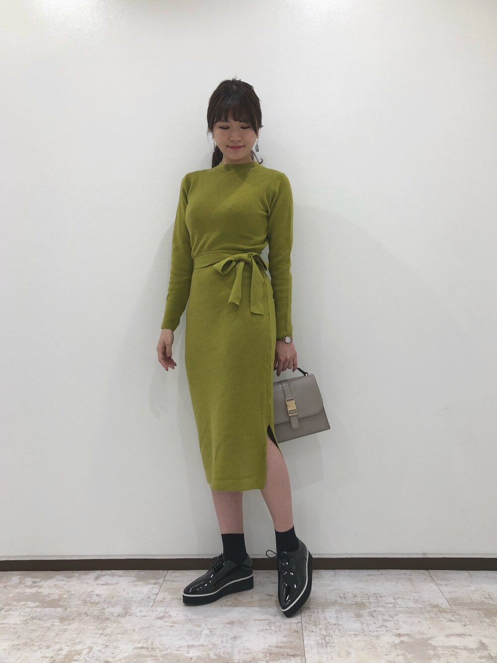 春色カラーのニットワンピース♪ ベーシックスタイルのシンプルさに ローファー合わせで、 大人モードの春の休日コーデに◎