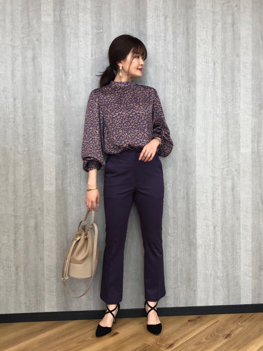 オリジナルの小花柄ブラウス✴︎ 秋1枚あるだけでオンオフの 着回しが楽しめそうです♪ 袖がゴムで腕まわりも綺麗に見せてくれます◎ 秋のワントーンオフィススタイルに⭐︎