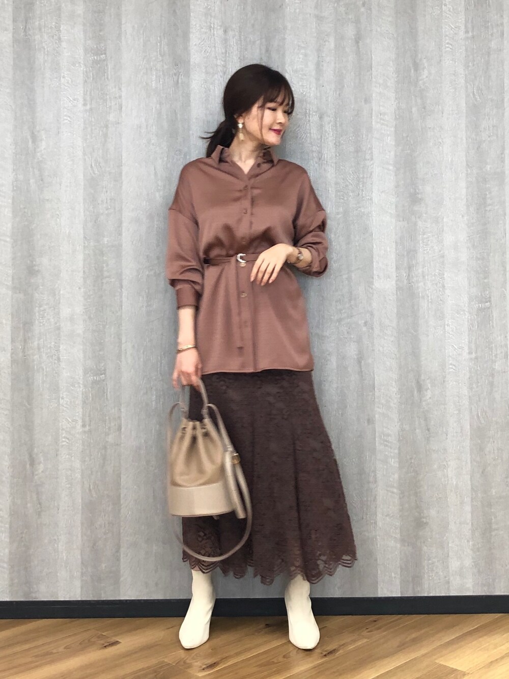 ウエストベルトがあることでロングスカートとの合わせでもスタイルの引き締めに◎ 女らしさもだせる艶のあるサテンシャツは 秋欲しい1枚です♪ 秋ブラウンで大人女子スタイルに♡