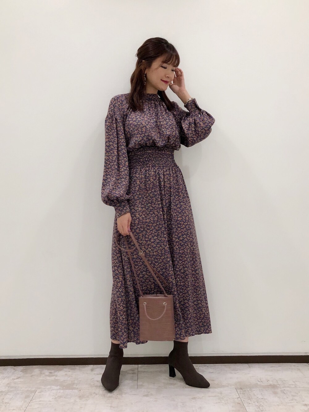 秋1枚でお洒落花柄ワンピース✴︎ 今年らしいパープルカラーで小物は 同系色に♪ ウエストゴムで着やすさ◎です!! 秋デートスタイルに♡