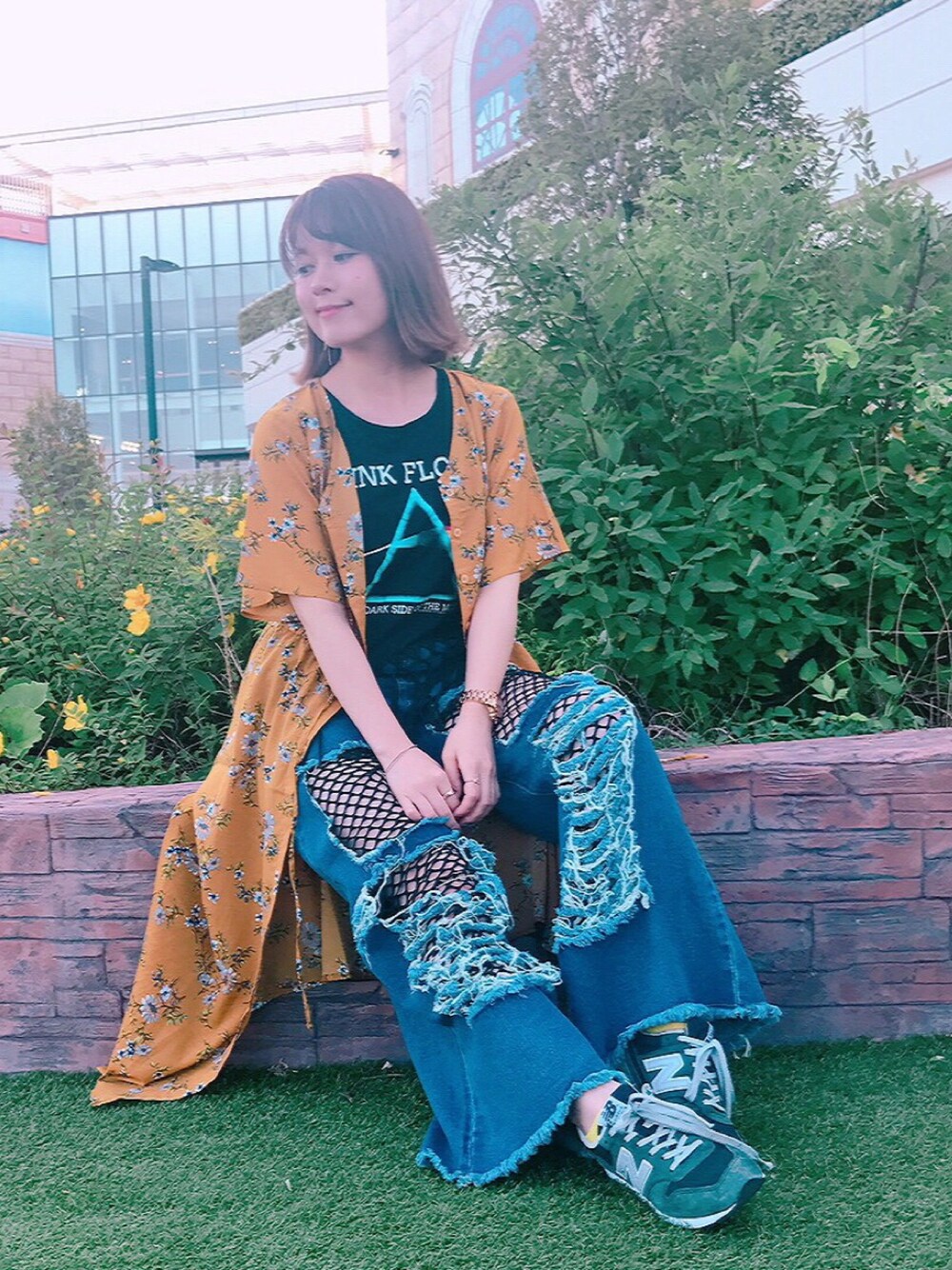 カジュアルなタンクトップとクラッシュデニムに花柄ガウンを合わせて辛さに甘さをプラス