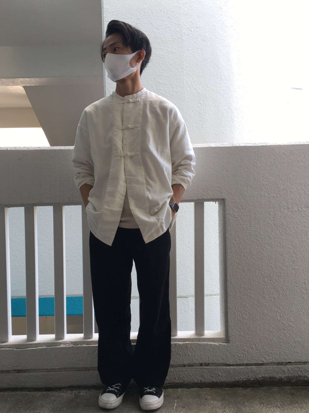モノトーンコーデ🏁 無印のチャイナシャツでちょっぴり変化をつけてみました。
