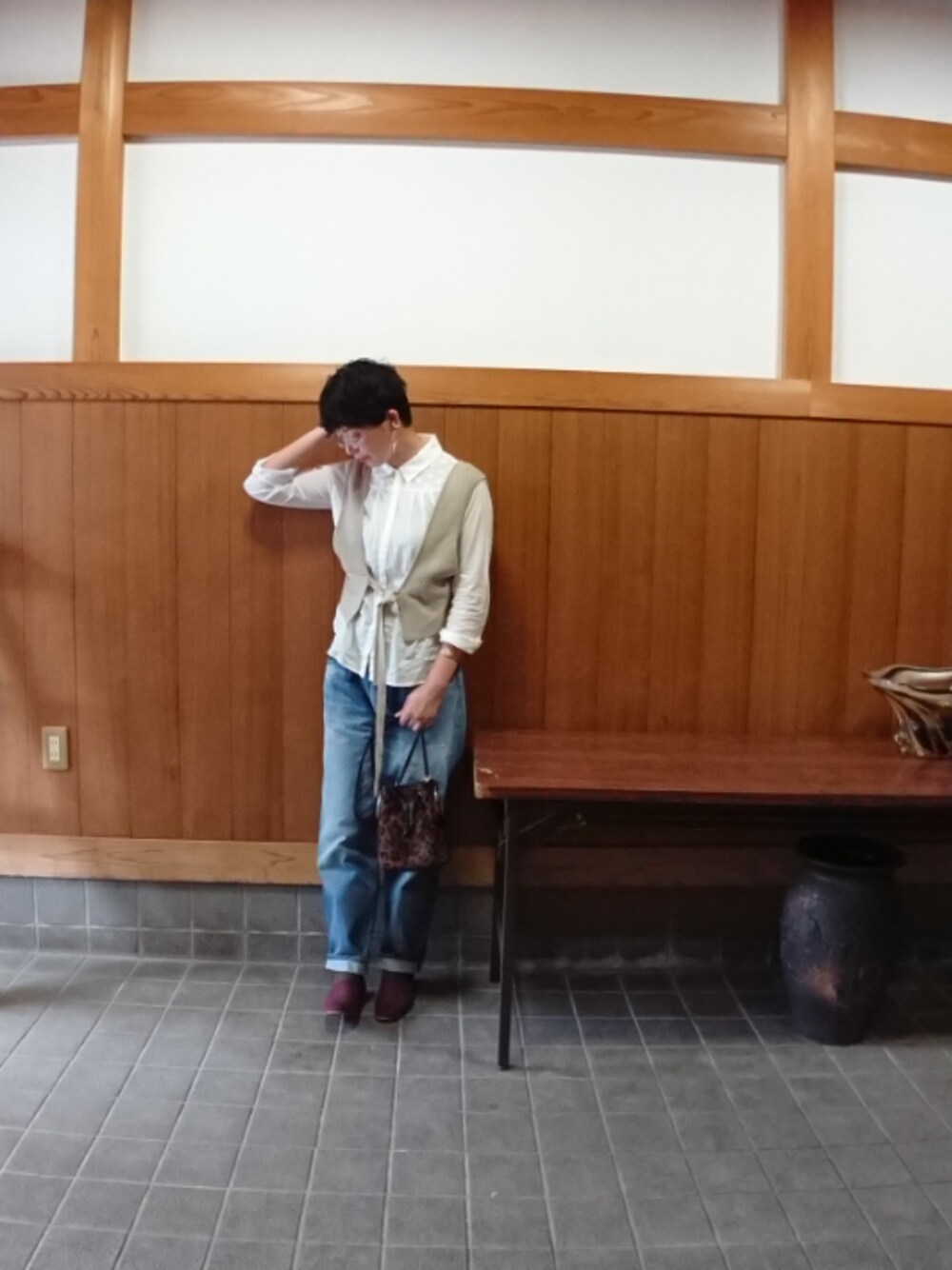 数年ぶりに着てみた レースの キレイなブラウス ジャストサイズなので ニットビスチェと ゆるっとしたジーンズにあわせて