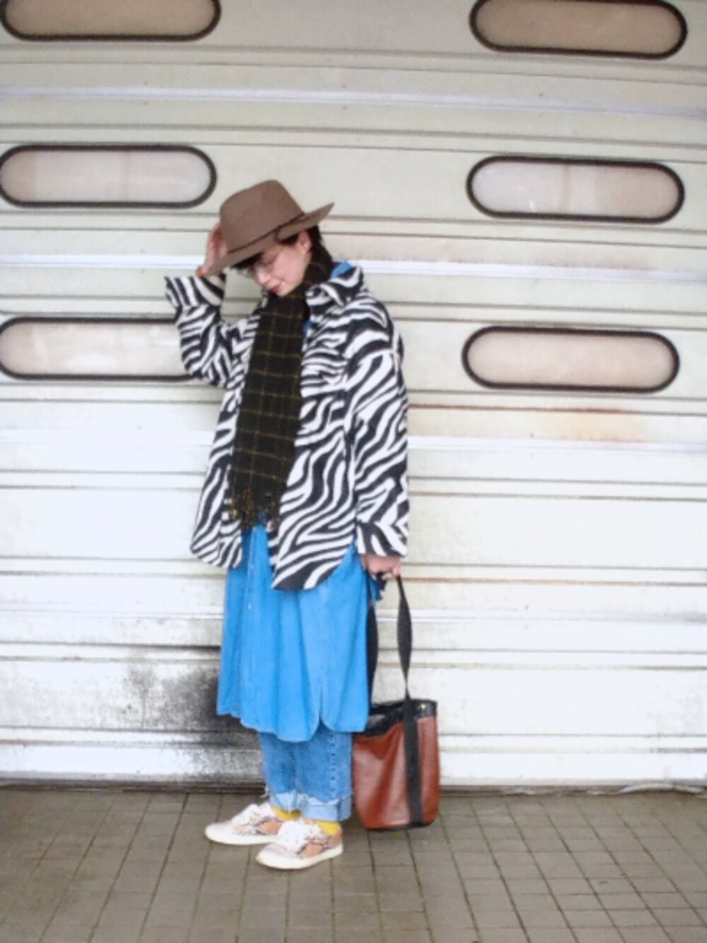 いつも いいね お気に入り フォロー ありがとうございます✴️ 📁in 💬 すごくうれしいです💗 『ゼブラ🦓シャツジャケット』 なんとなく 攻略法を発見 このジャケットは 丈にすると ちょうど お尻の下くらい 私がパンツ合わせで 一枚で着ると なーんか野暮ったい印象に デニムブルーの オーバーサイズシャツワンピースをinにして デニムonデニムの上からはおりました 膝下くらいの 分断になり 今どきのシルエットに 靴下もマフラーのチェックとリンクさせて黄色に スニーカーのパイソン柄で面白さも デニムのカジュアルさと ゼブラの大胆さも ハットと サルティの力で一気に上品見えが 赤マフラーと白ブーツあわせも小窓に ゼブラ🦓を攻略するカギは レディ要素と 分断のバランス そして 色合わせ