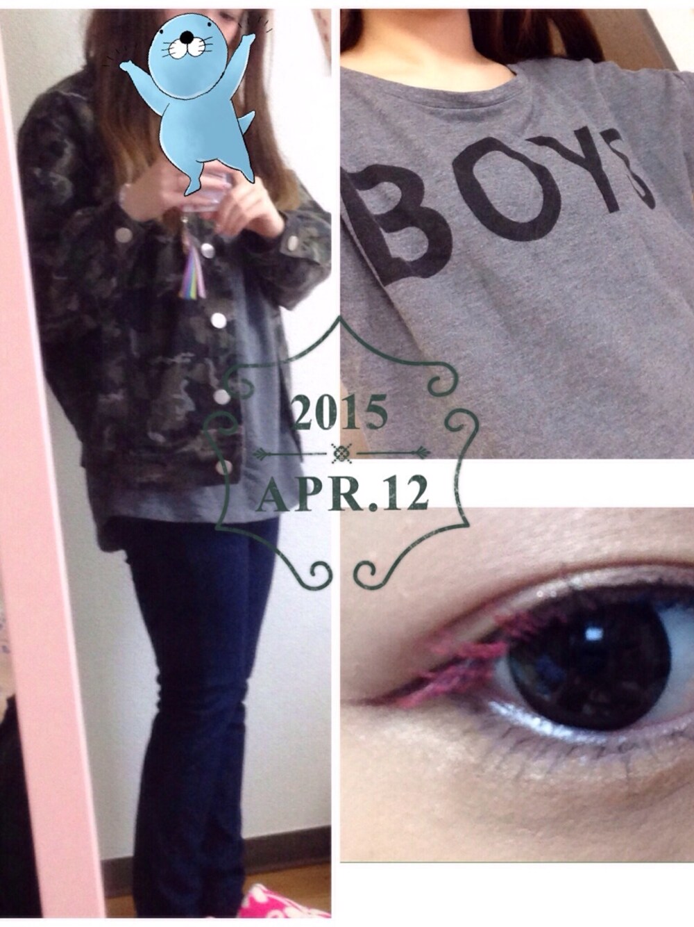 今日はカジュアル( ˙-˙ )౨ 迷彩可愛いけど似合わない〜〜(笑) 目尻にピンクのカラーマスカラ💗