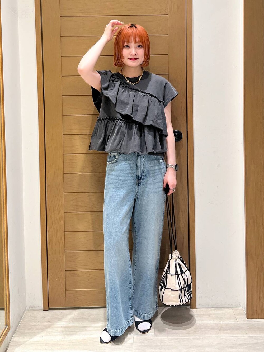 フリルが可愛い💕 デニム合わせが⭕️ 自己紹介🎀 BAYFLOW 札幌発寒店📍 98' | 164cm 骨格ストレートの方のための着痩せスタイリングを提案しています✨ 特に肩周りのボリュームや、肩幅をカバーする着痩せコーデが得意です! Instagramでもコーデ紹介してます🌼 よかったらフォローしてくださると嬉しいです🤍
