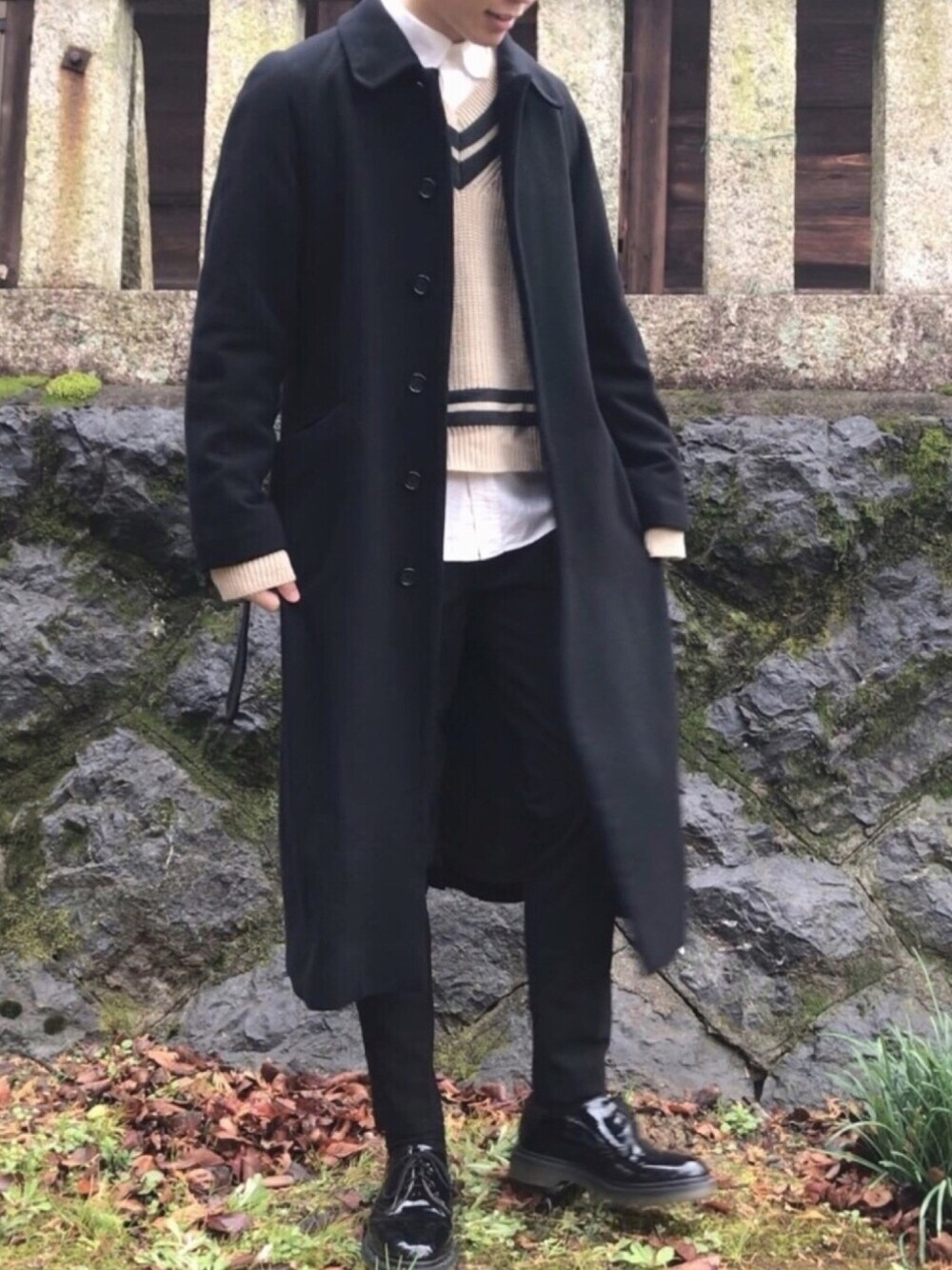 ロングコートコーデ!! ロングコートに細身のスラックスを合わせVシルエットのスタイルが良く見えるコーデです! 黒い中に白シャツが見えることで清潔感+してます✨ チルデンニットの可愛らしいさとロングコートの大人っぽさが良い感じ◎ <サイズ> アウター:M ニット:free シャツ:M パンツ:M 靴:8inch