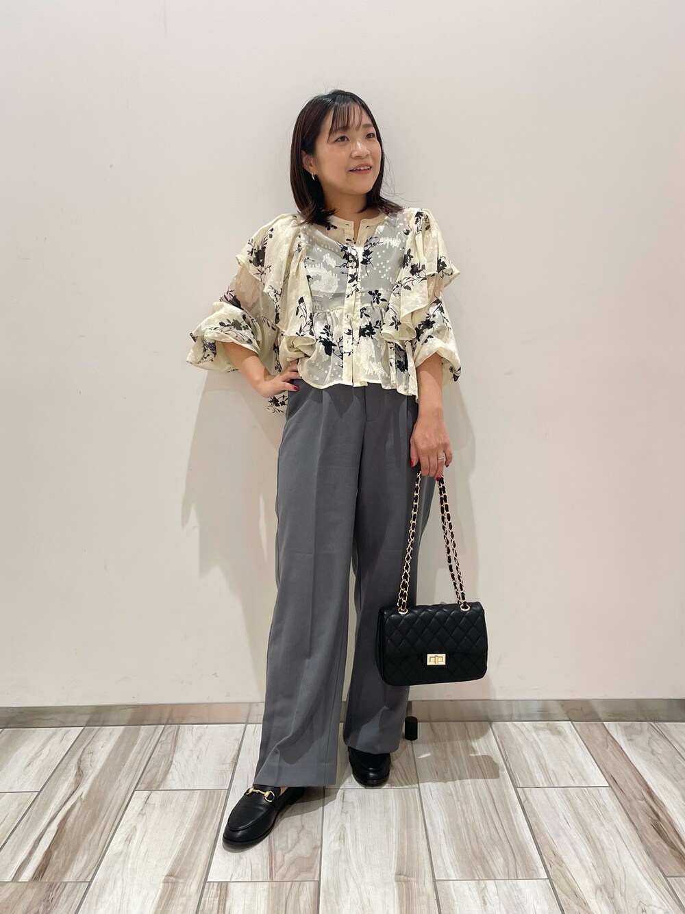 花柄ブラウスがポイントで 甘さ控えめにコーディネートしました! オフィスカジュアルでも、お子様の授業参観やお宮参り、七五三にもオススメ。
