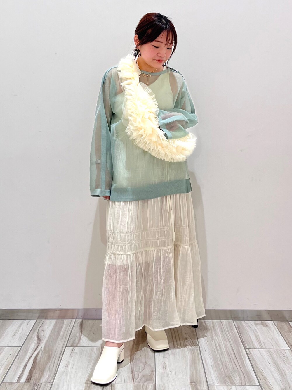 ショルダーラインシアーニット💚 シャーリングティアードスカート🤍 グリーン×ホワイトで爽やかコーデ🍀 小物もホワイトで統一して フェミニンカジュアルスタイル✨
