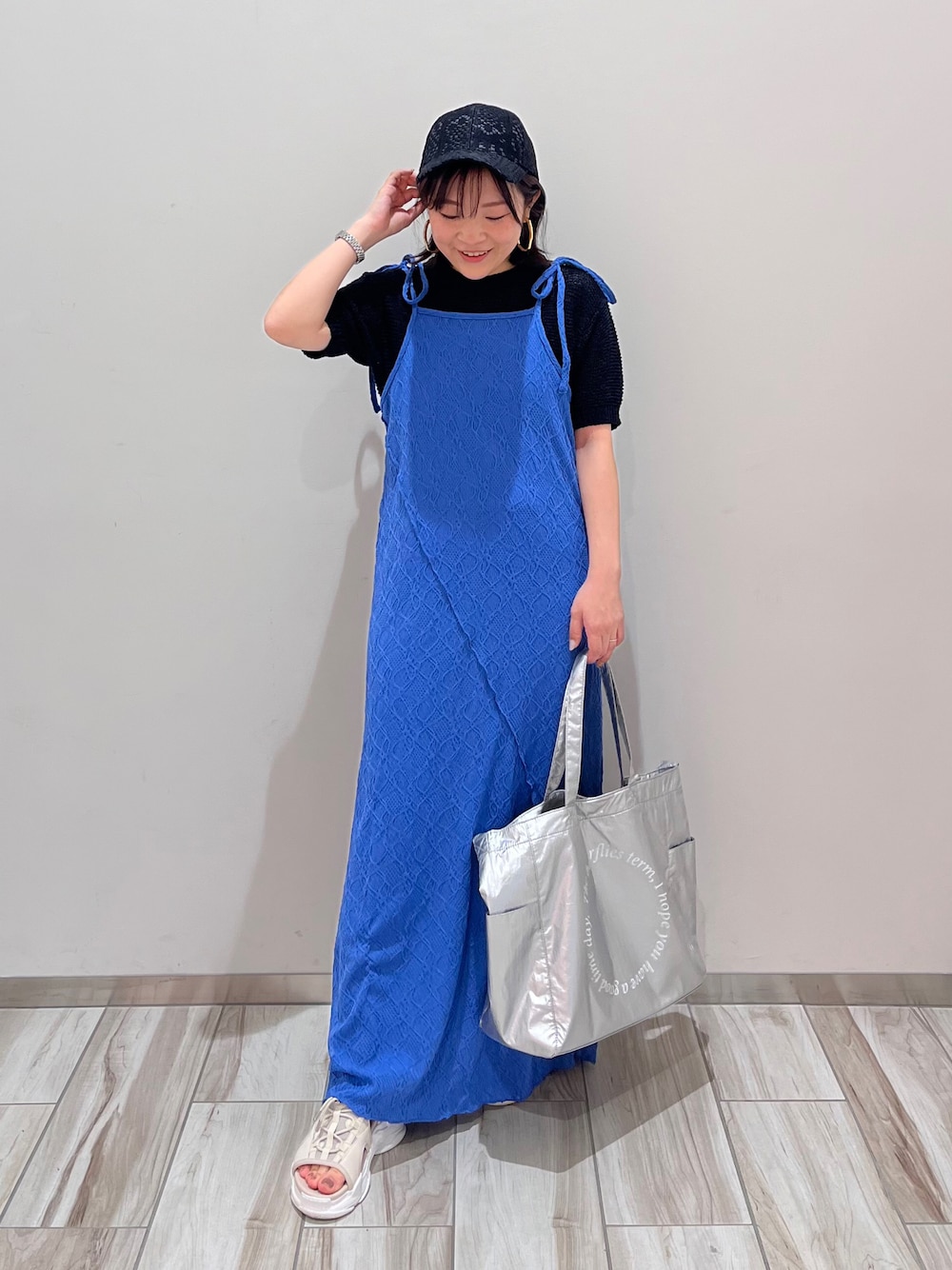 ブルーが映える初夏コーデ♡ キャミワンピースのインナーにシアーニットを合わせました!! シルバーのバッグで清涼感のある爽やかな印象に!! 夏のお出かけ、小旅行にもオススメ!!