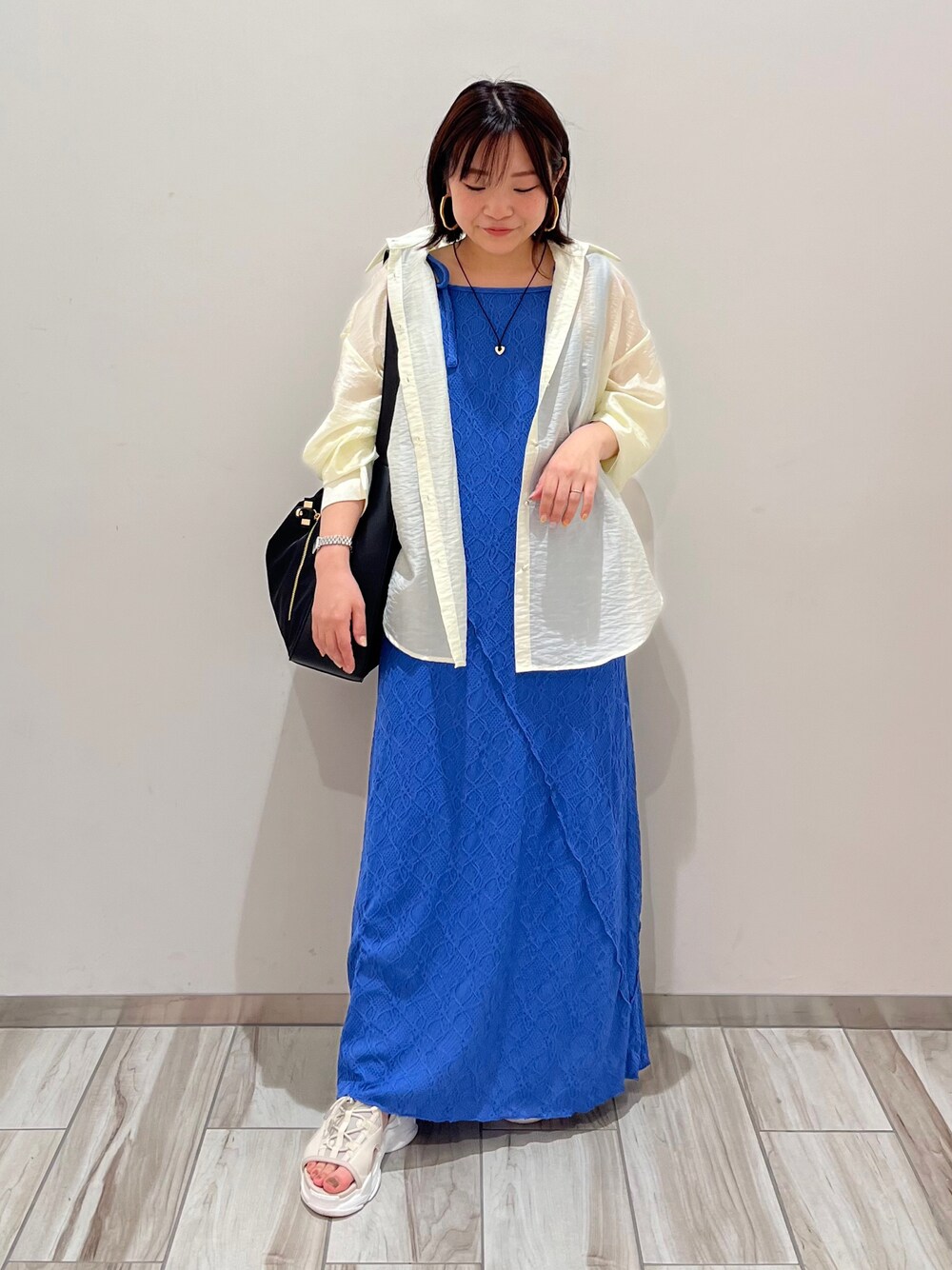 シアーシャツを羽織り、大人カジュアルコーデ♡ ブルーのキャミワンピースがアクセントになる夏コーデです☺︎