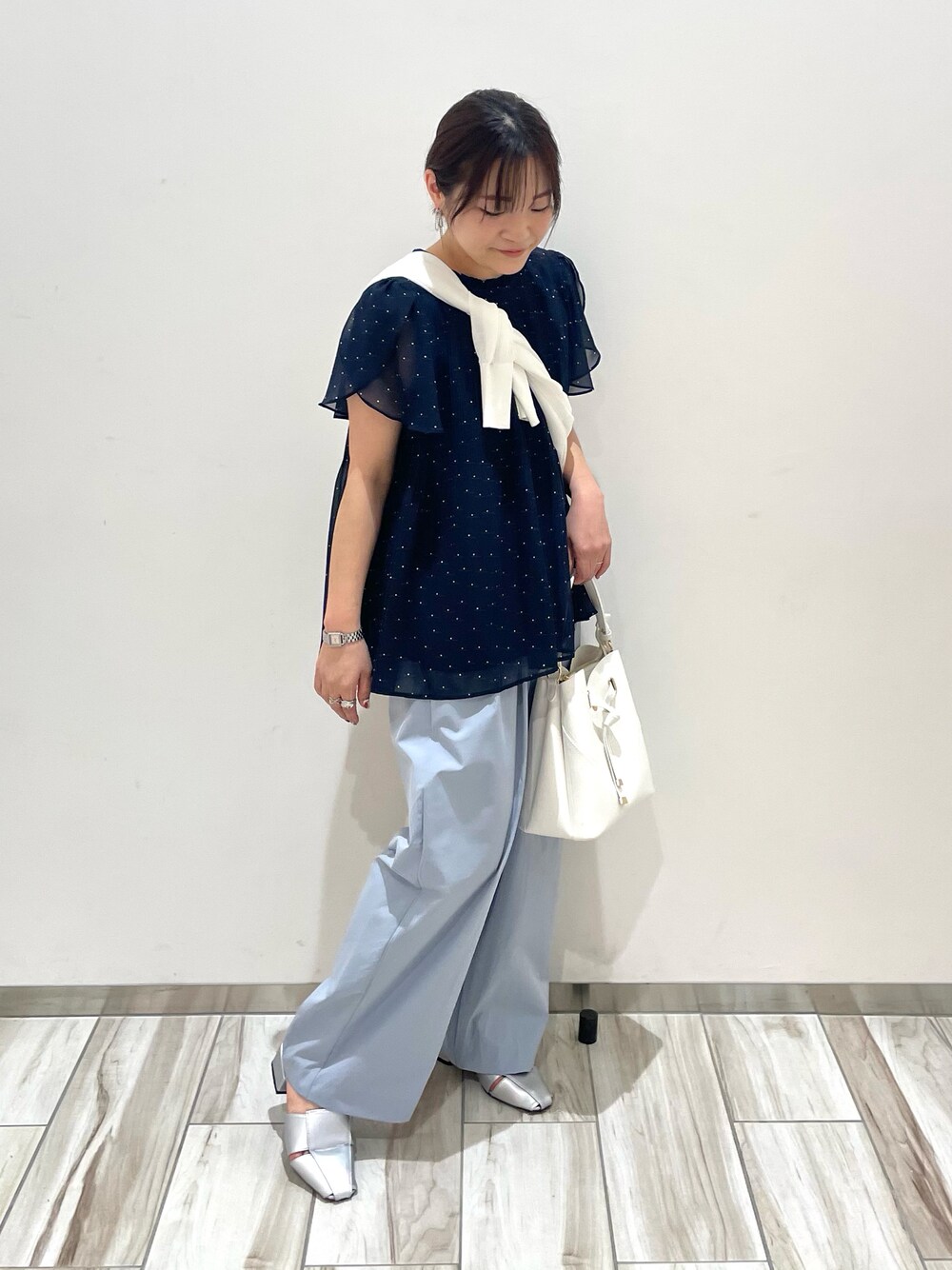 ネイビーのドット柄のブラウスにタックギャザーパンツのブルーでキレイめコーデ✨ 濃淡のあるカラーの合わせ方で 清涼感があり、きちんと感の印象に! 夏のオフィスコーデ、セミフォーマルコーデにオススメです❤️☺️