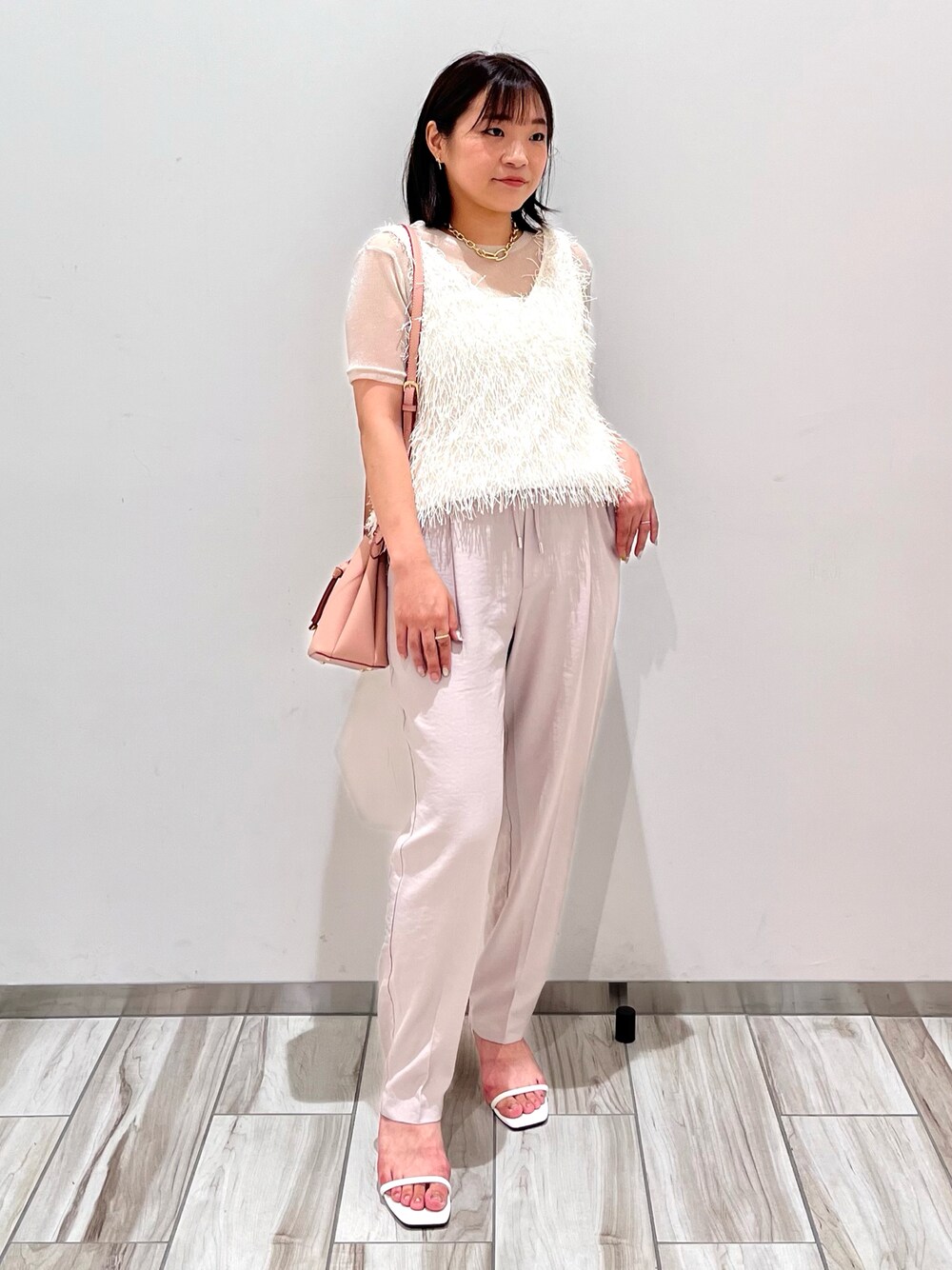 フリンジノースリーブトップスに インナーでシアーラメトップスを合わせて 華やかでレディな印象に✨ テーパードパンツでキチンと感を! 全体的にワントーンでまとめてみました😊