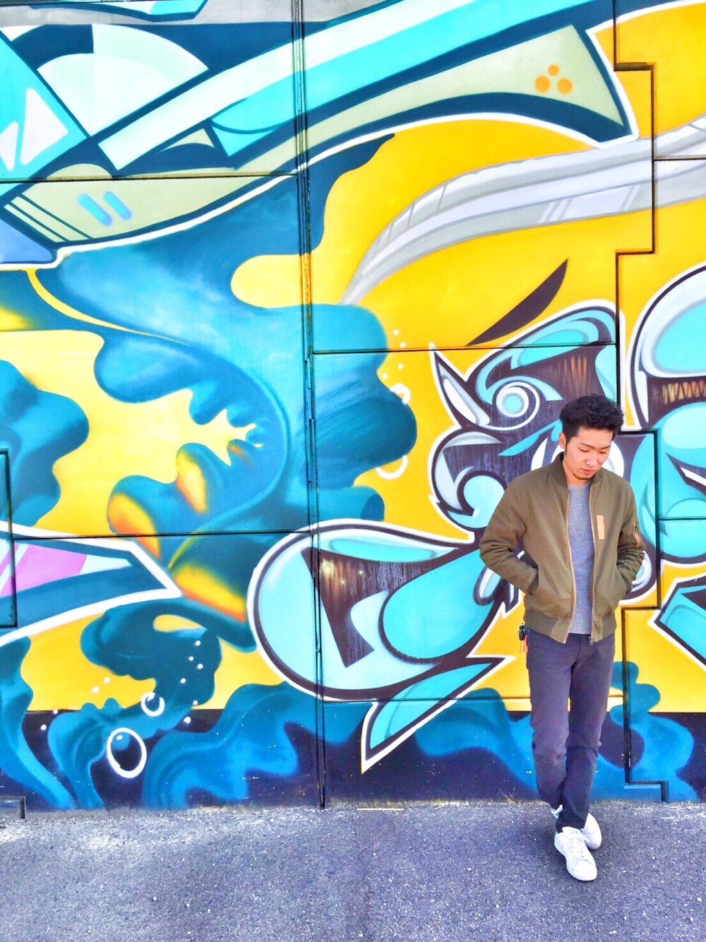 シンプルの灰色のニットにma-1のカーキを重ねワンポイントのアクセントにしています。足元はスタンスミス