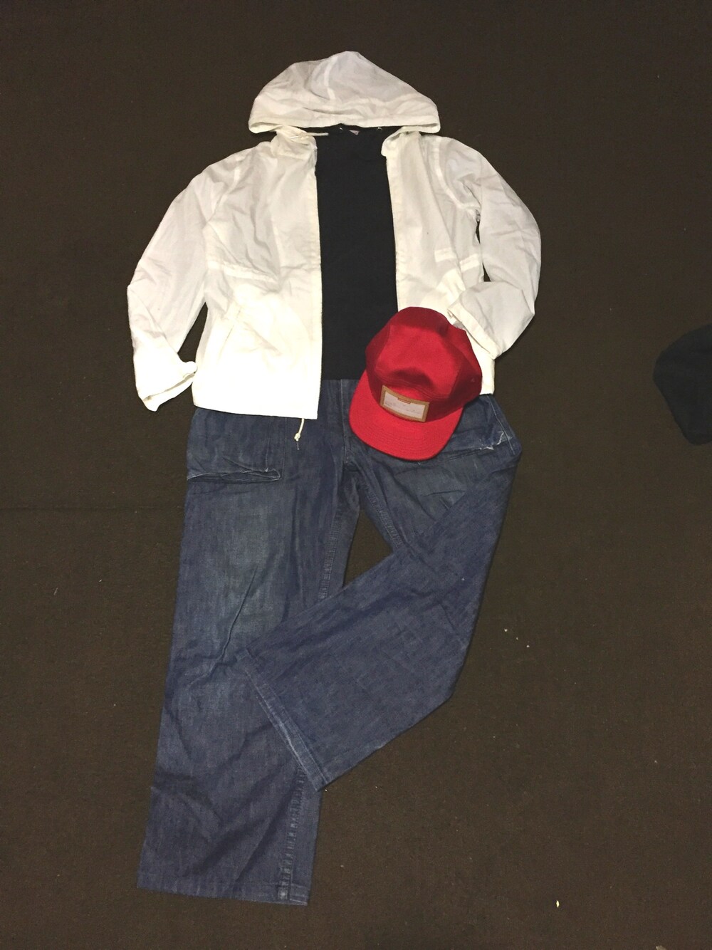 ストリートっぽい服装。 赤の帽子がワンポイント