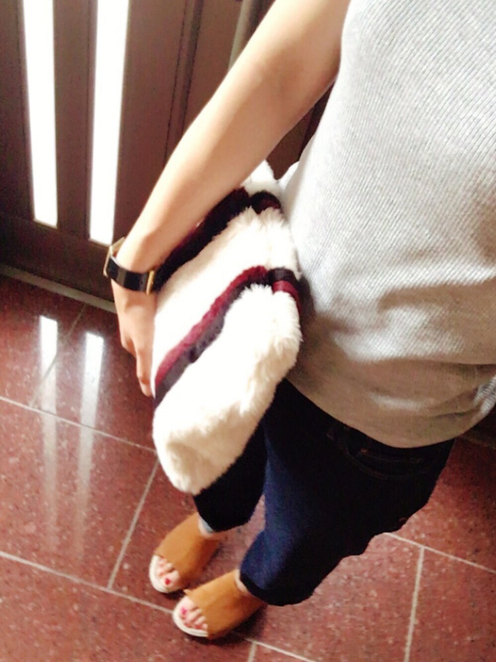 ririri___:)のクラッチバッグ「レジメンタルストライプ調ファークラッチバッグ」を使ったコーディネート