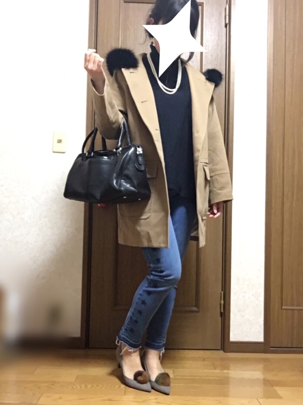 aquagirlのコートは綿100%で地は薄いですが、目が詰まっているので風を通しません🙆 ファーがとても上質で高級感⭕️ 安定のGAPのデニムは元値約一万円を二千円でゲット🙆 星がかわいい〜⭐️ RANDAのパンプスは一目惚れしてからずっと欲しくて欲しくて、後日買いに行ったらまさかのセールでお安くゲット🙆