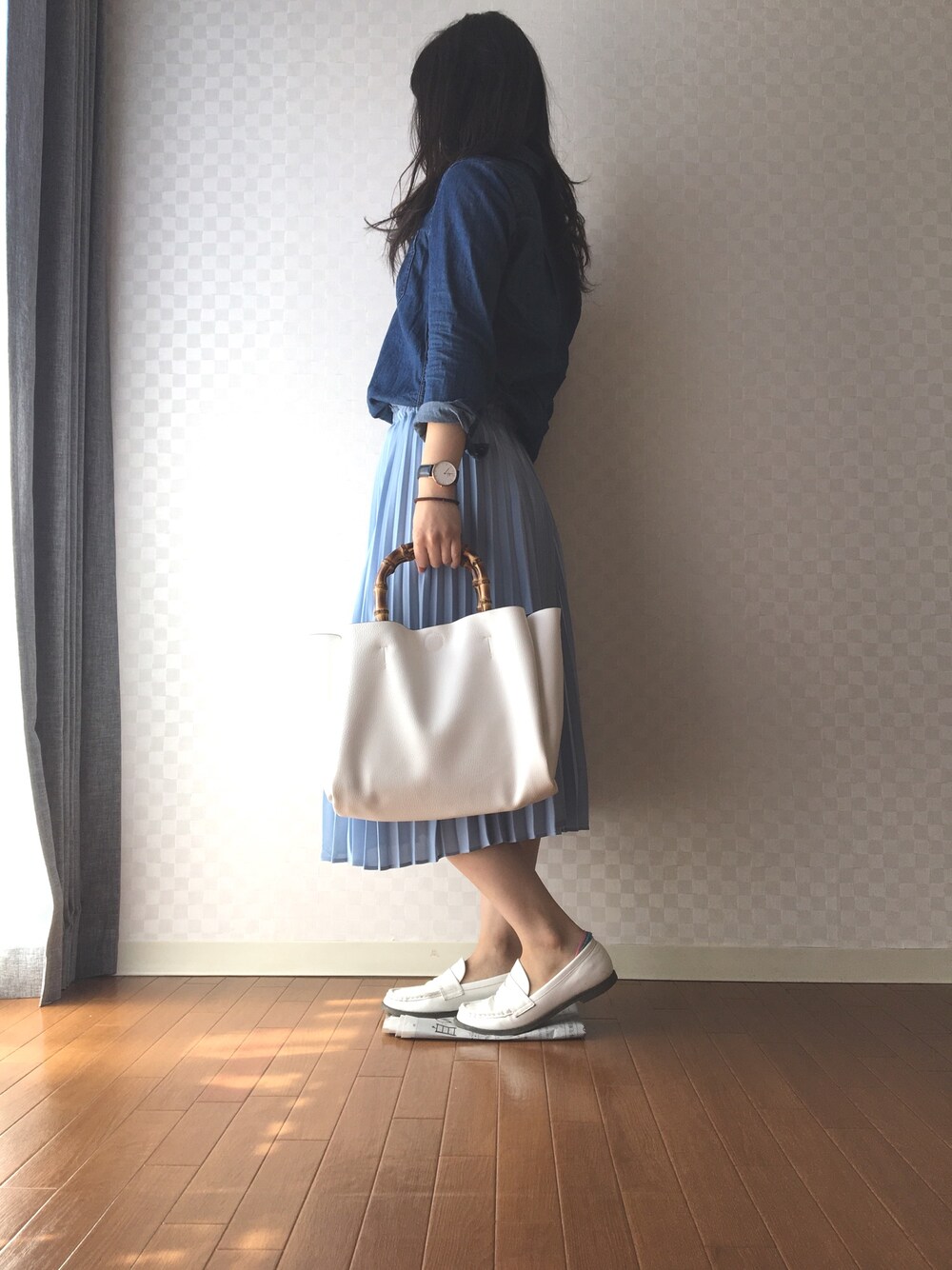 春になると小物は白にしたくなります!!! 新聞紙を敷いていたりかかとから靴下が見えてるいるところはスルーしてください…雑