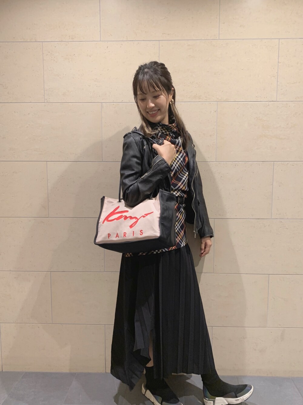 会社が何故かまだ暑いので、中は半袖の変形トップス❤️💛 変形スカート・革ジャンと合わせて、チェックが可愛くなり過ぎないようにしました💛❤️