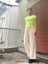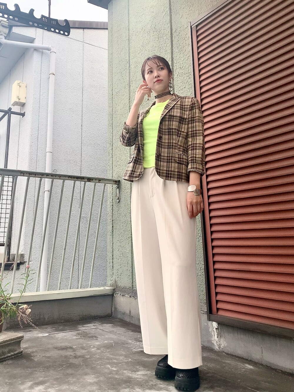ネオンイエローのMAX&Co.のTシャツに、意外にもチェックのジャケットが合いました💛 チョーカーと靴は、メッシュ感あるもので暑苦しく無いように♪