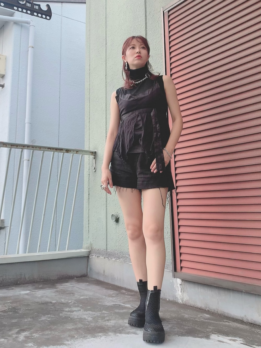 本日はオールブラックコーデ🖤 トップスのトップスは女性らしいデザインなので髪型もハーフアップで☺️ シルバーアクセサリー大好きすぎる❤️