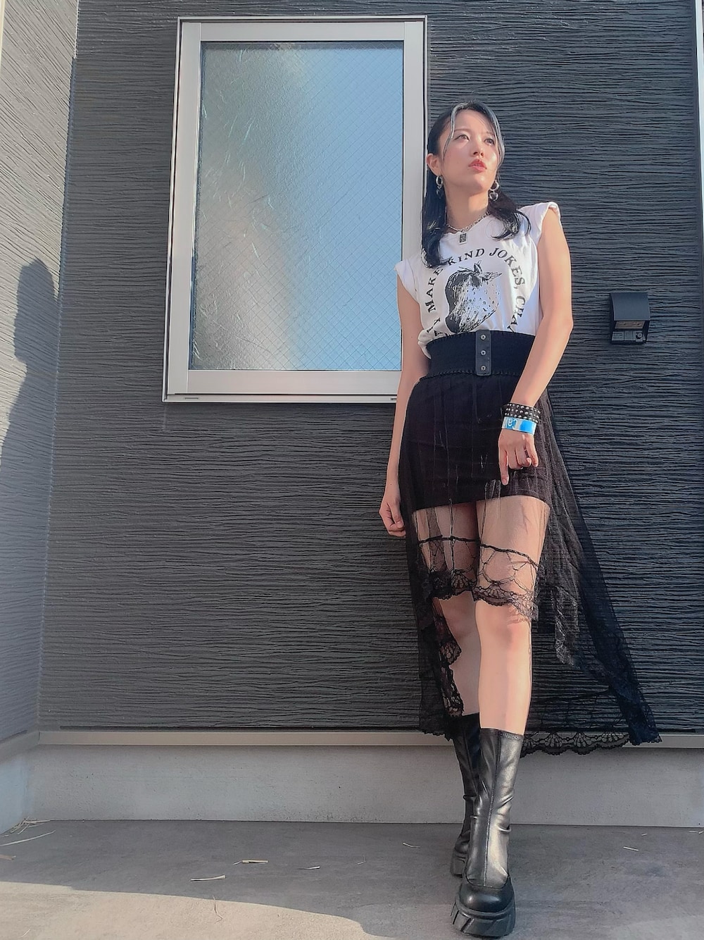 今日は自分のバンド Cakes n' Ale のTシャツ&ラバーバンドと Vo.makoが特別に作ってくれた 可愛すぎるネックレスのコーデです🖤 モノトーン+前髪&ラバーバンドの青で差し色にしている、 つもり。笑