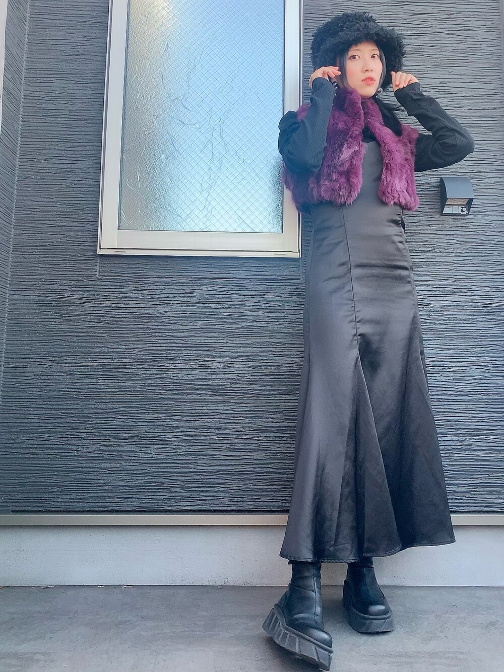 ハロウィンっぽコーデ💜 写真毎に一個ずつアイテムを引き算していきます✨ PSYCHONATIONのファーハットが可愛すぎる…