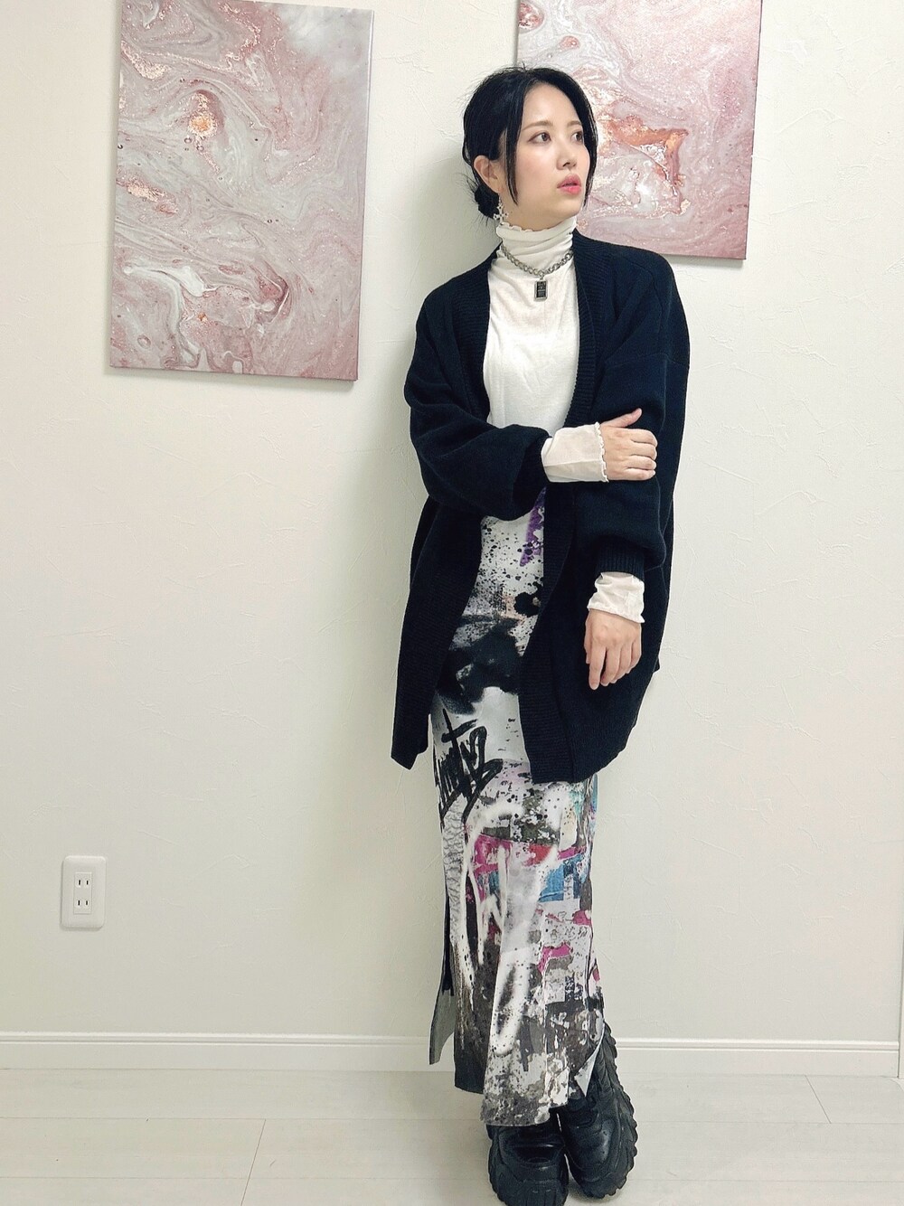 会社にギリギリ着て行ける感じの総柄スカートがお気に入り💕 靴は厚底にして、身長を高く見せる手法です笑