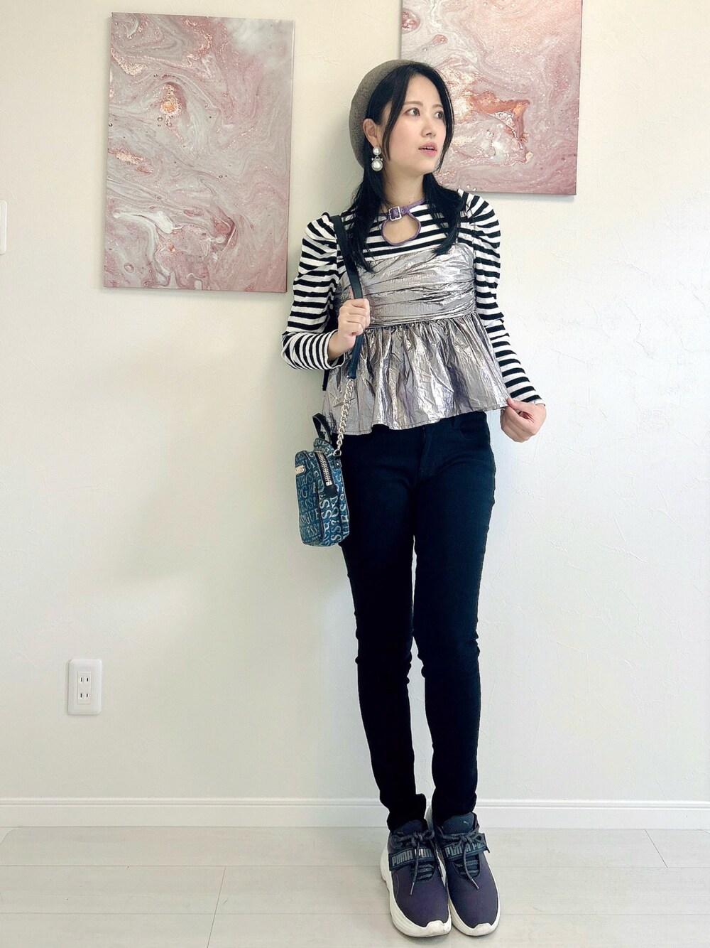 平日なのでどこに行くわけでもないのだけど メンバーが家に来て編曲作業をするので 自己満足的にコーデ✨笑 皆でお外に遊びに行くなら、たまにはスニーカーコーデもいいかなあと。 帽子、キャミソール(はシルバーだけどw) スニーカー のグレーを主役にしてみました🩶