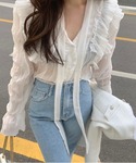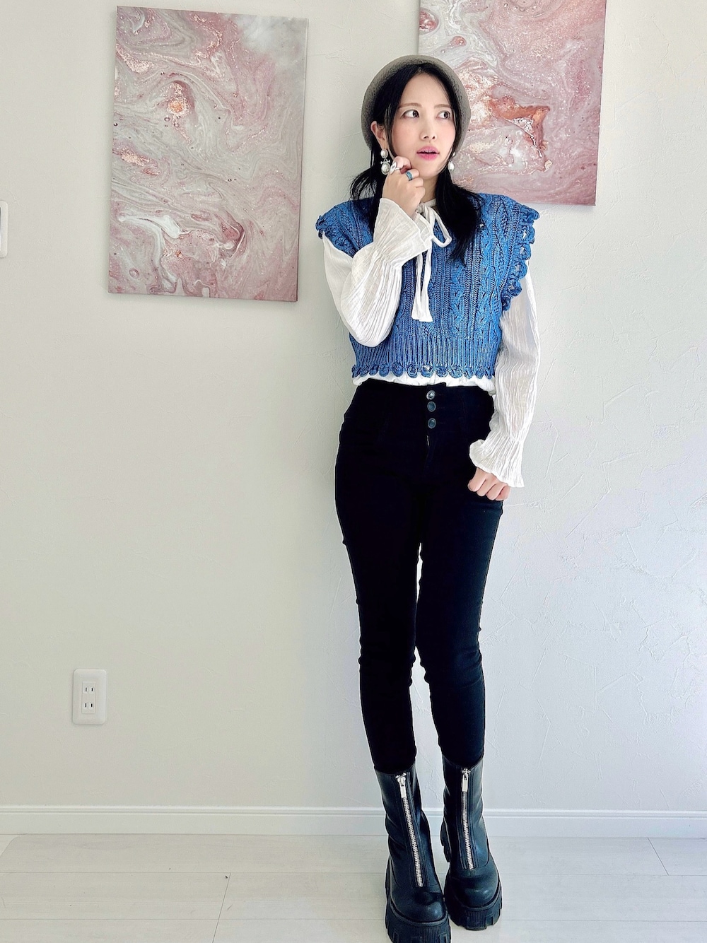 昼は暑いけど、朝晩は涼しいので ブラウスの上にメタリックなショートニットをONしてみた💙 ブラウスのリボンを見せるスタイルがお気に入り✨