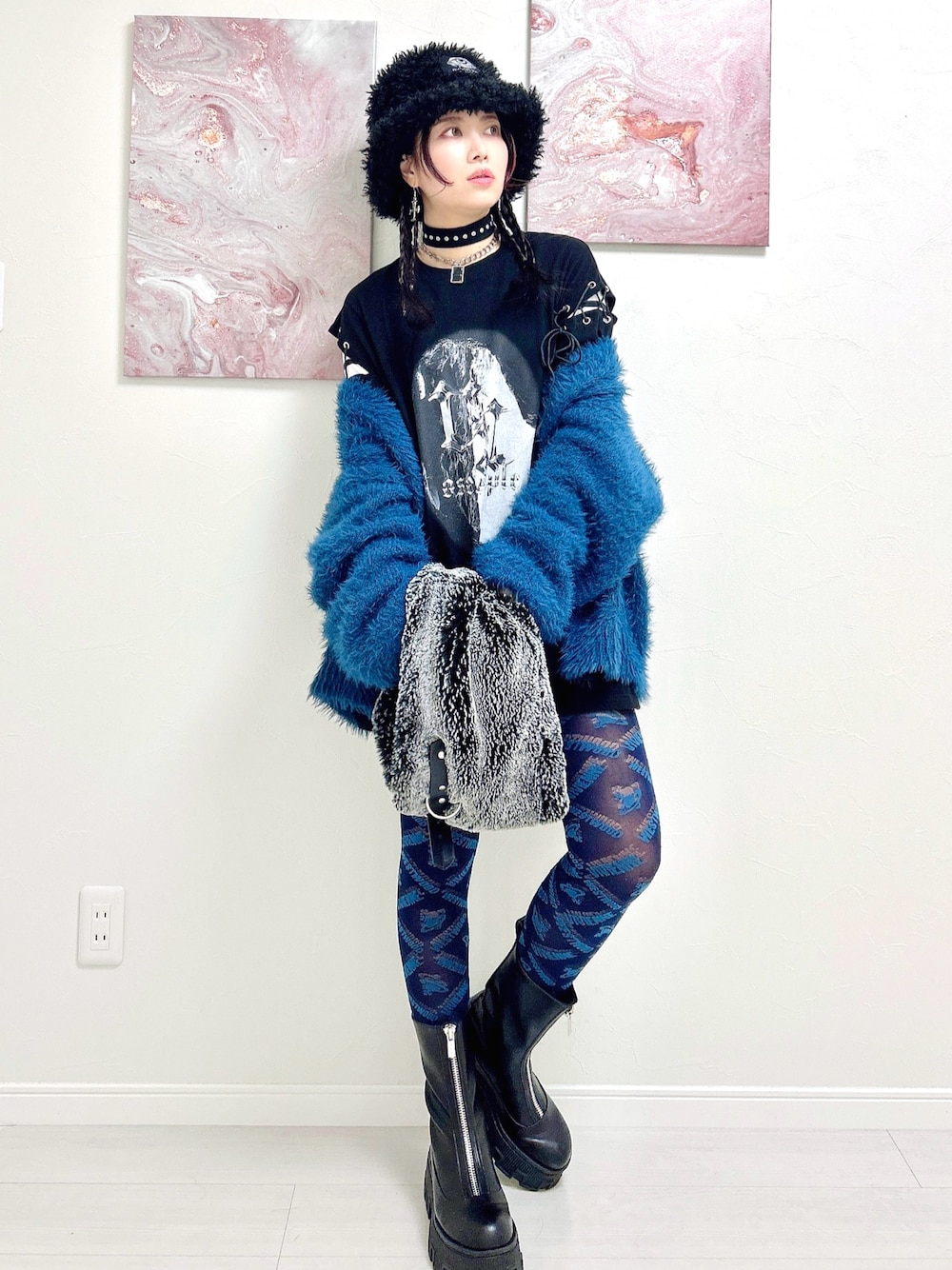 こないだは赤いもふもふコーデだったので 今日は青いもふもふコーデ💙 首、手首、足首を防寒していたら体感温度が高くなるので、カーディガンでも充分過ごせる🖤