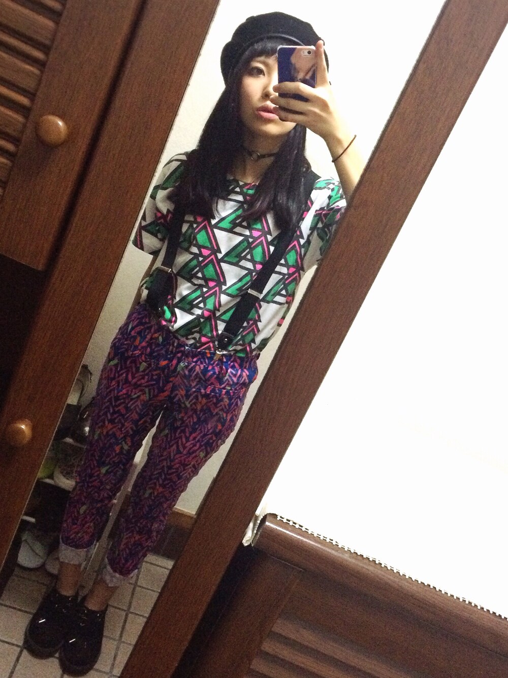 久々にパンチ効かせたフファッション!! これが素性。 ニュリカデリックの可愛すぎるハーネス付きベレー帽×派手柄の相性か最高です!