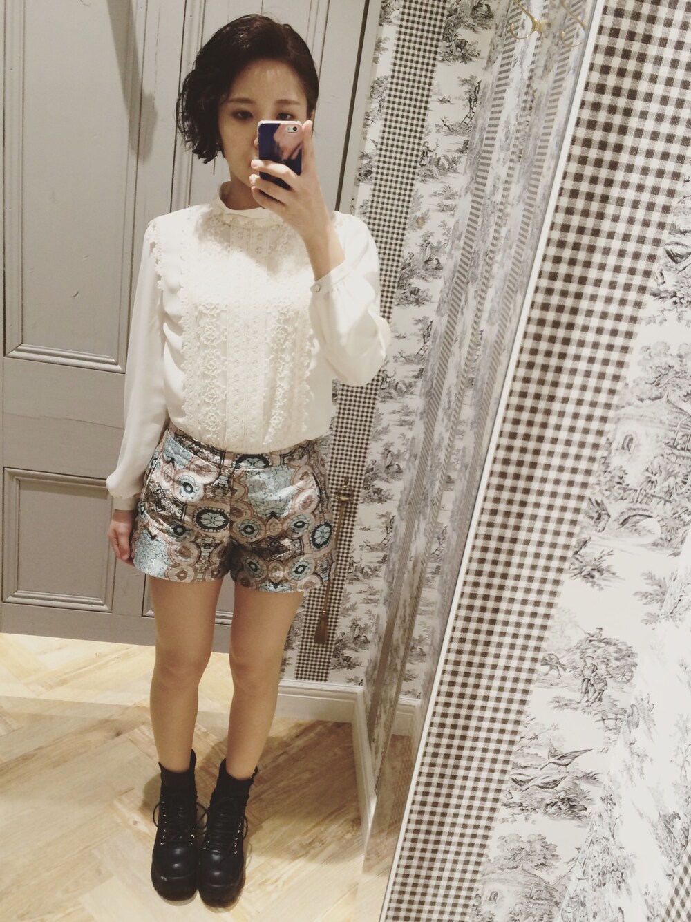 上品なブラウスを甘辛に着たくて、髪型とブーツをクールな感じにして幾何学のショーパンを履いてみました