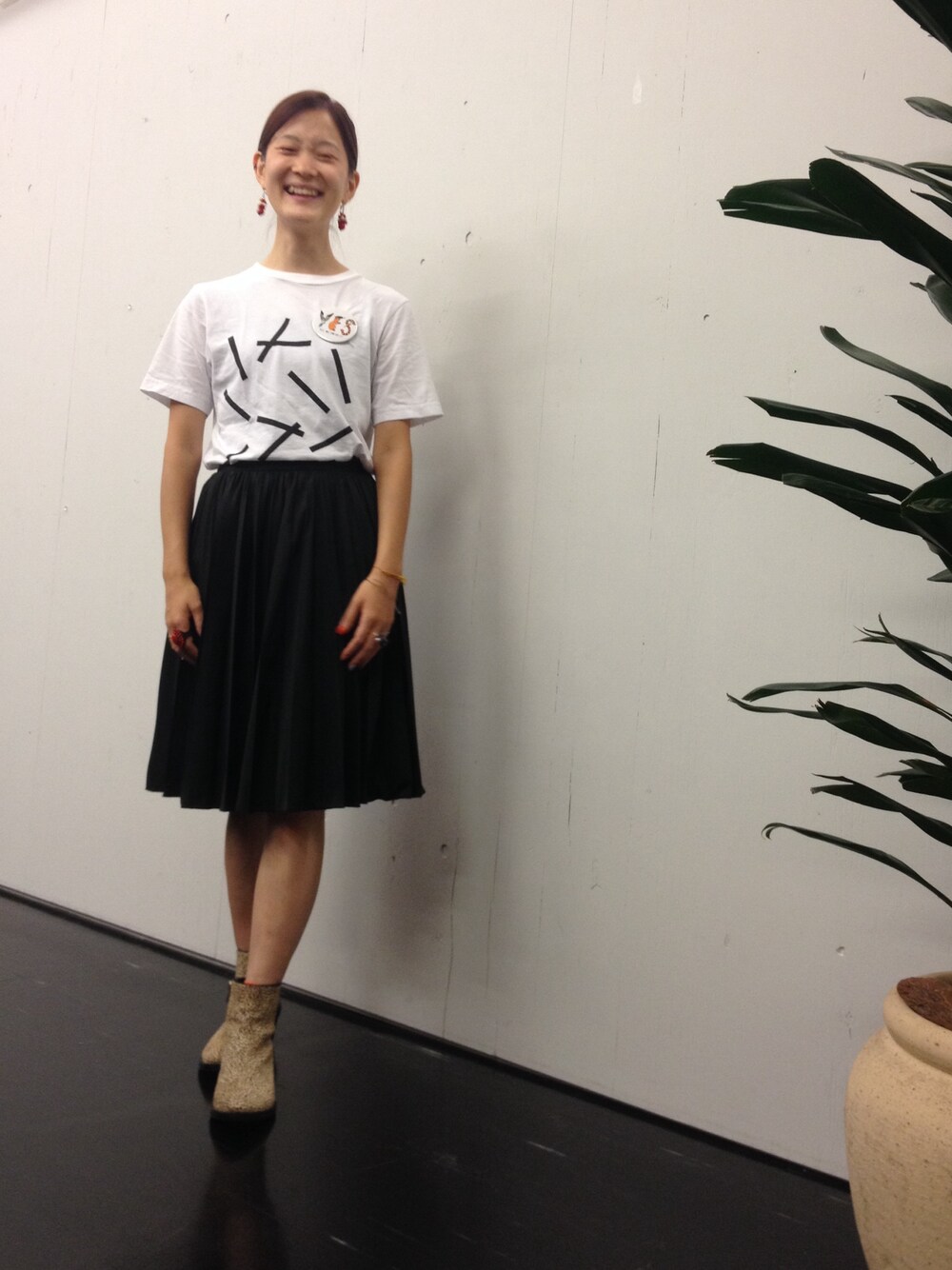 撮影者はbprBEAMSオフィスの佐々木さん。 人を笑わせるのが得意な方で、私もこんなにくしゃくしゃな顔にされてしまいました。 と、関係ないことは置いておいて。 ずーっと狙っていたRAYBEAMSのプリーツスカートをやっと買ったので、合わせてみました。 お供はYESブローチ!こちら、よく見ると動物たちが一生懸命YESポーズをとっているんです♪ きざみ海苔みたいなプリントのTシャツはサタデーズのもの。