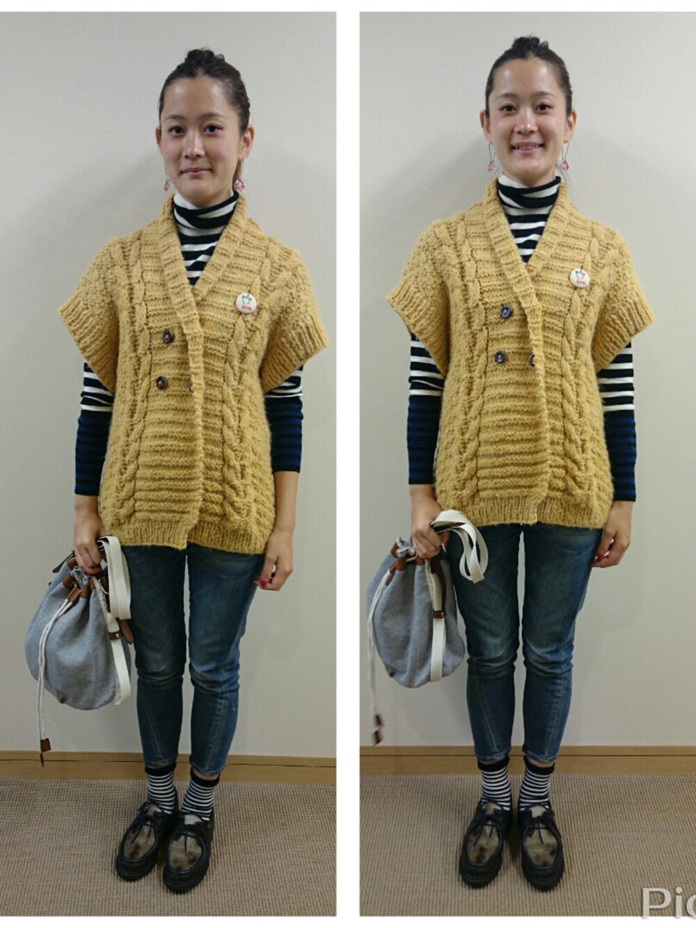 前に撮ってあげていなかった写真です☀ ニットの重ね着にデニムパンツを会わせたシンプルコーデ!! サンヒデアキのバックはリュックにもなって持ちやすいんです♪