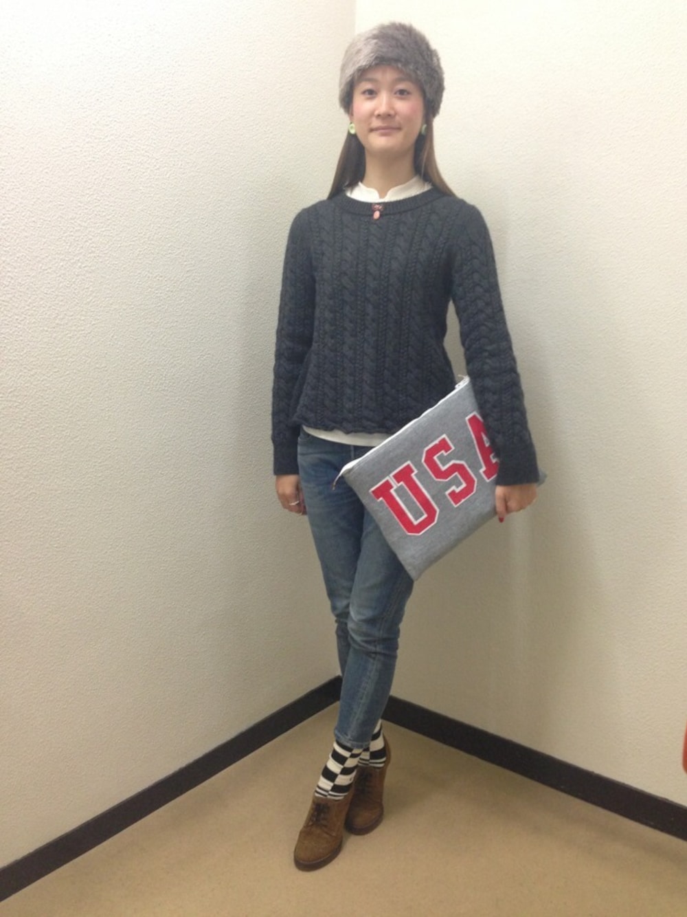 フェイクファーのヘアバンドをメインにしたコーデ! 寒くなってきたので小物であったかさをプラスしました!カジュアルになり過ぎないようにヒールを合わせてキレイめに! センターにつけたブローチはガラス教室で作ったやつ。ガラス教室楽しい♪