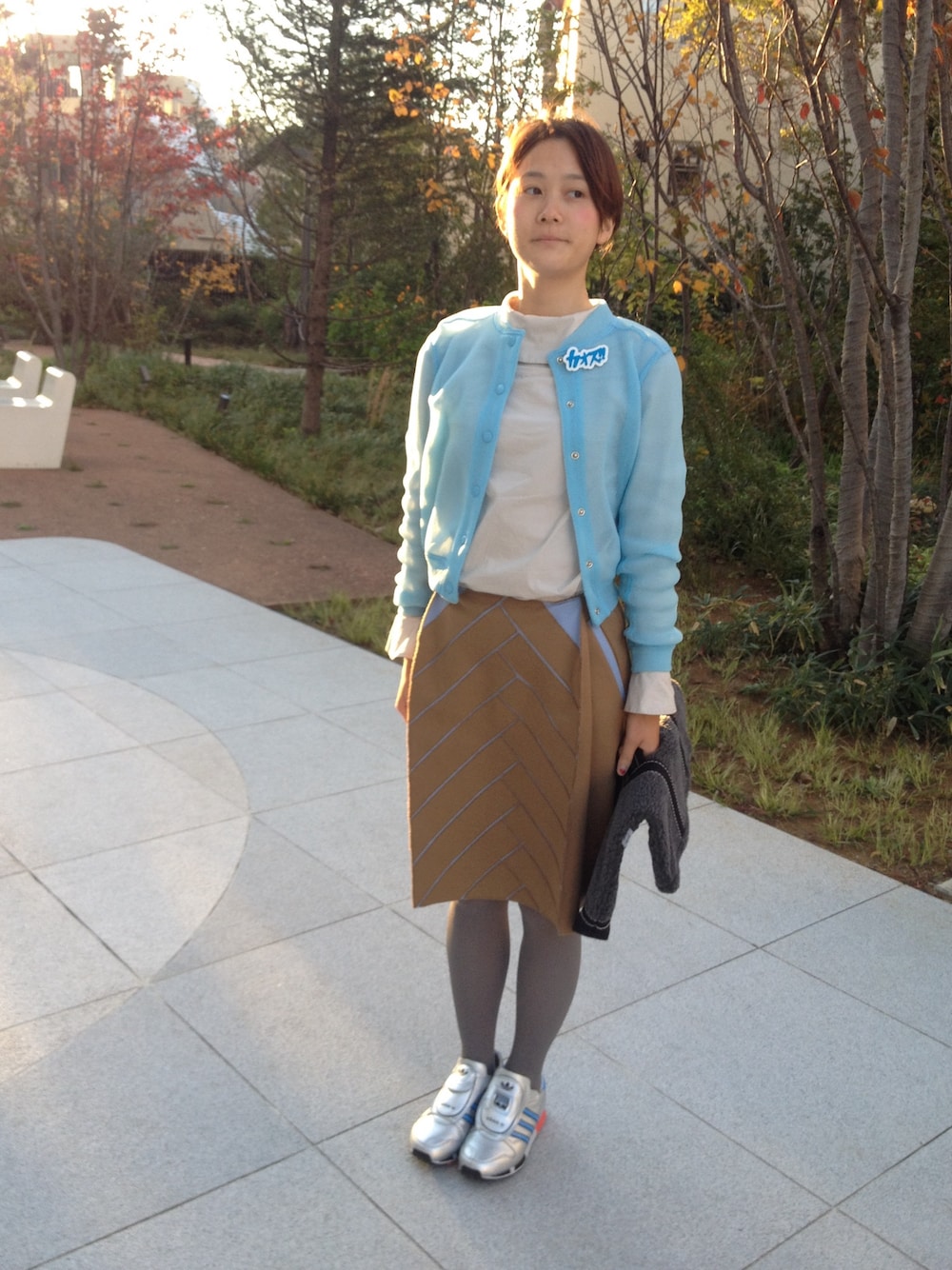 テーマは 派手な事務の人。 膝丈スカートにスニーカーを合わせて、カーディガン見たなブルゾンみたいなやつを羽織りました。そしたら、地味なのか、派手なのか、わからない感じになりました!! アクセントにmmtsのカオスブローチをつけたら、「本当にカオスだね。」とお姉ちゃんに言われました。 水色の羽織は、お気に入りブランド「SPIJKERS en SPIJKERS」のもの。 9月入荷と言われていたのに、この前届きました。インポートって本当にいつ入って来るのかわからないところがいいですよね!笑