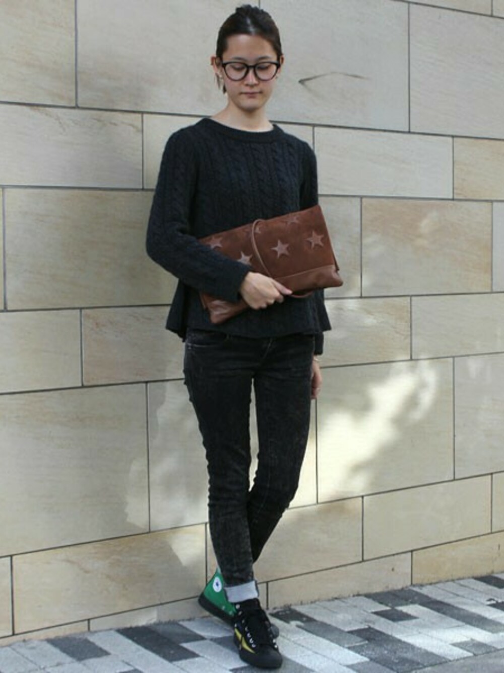 黒ぶちメガネで知的スタイル!! 大き目クラッチでトレンド感をプラスしました。