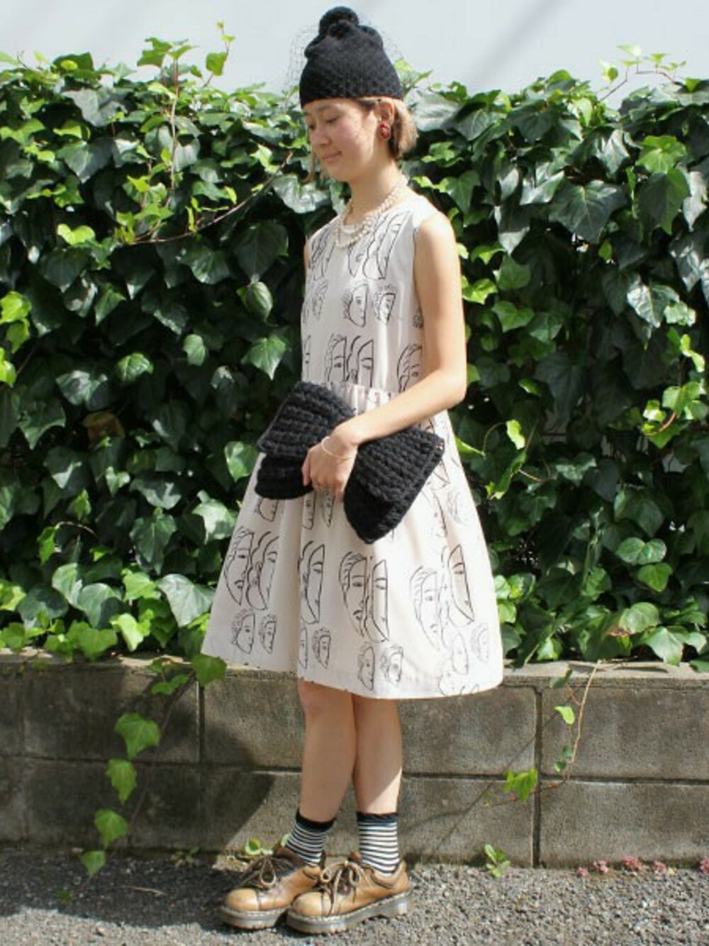 日差しの強い日は、アクセサリーだけでも冬ものを使いたい。と、思いまして。 ニットのバッグと帽子のモノトーンコーデに、耳元だけ真っ赤なビジューイヤリングを加えました。