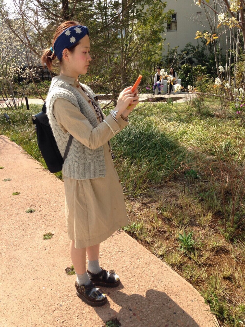 可愛いお花が咲いていたので撮影! している風ポーズ 風邪をこじらせたため、暖かな春の陽気も感じず、トレンチにニットベストを合わせて防寒。 手首に光るradaはビームス別注ブレスレットです☆